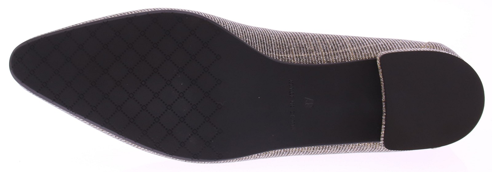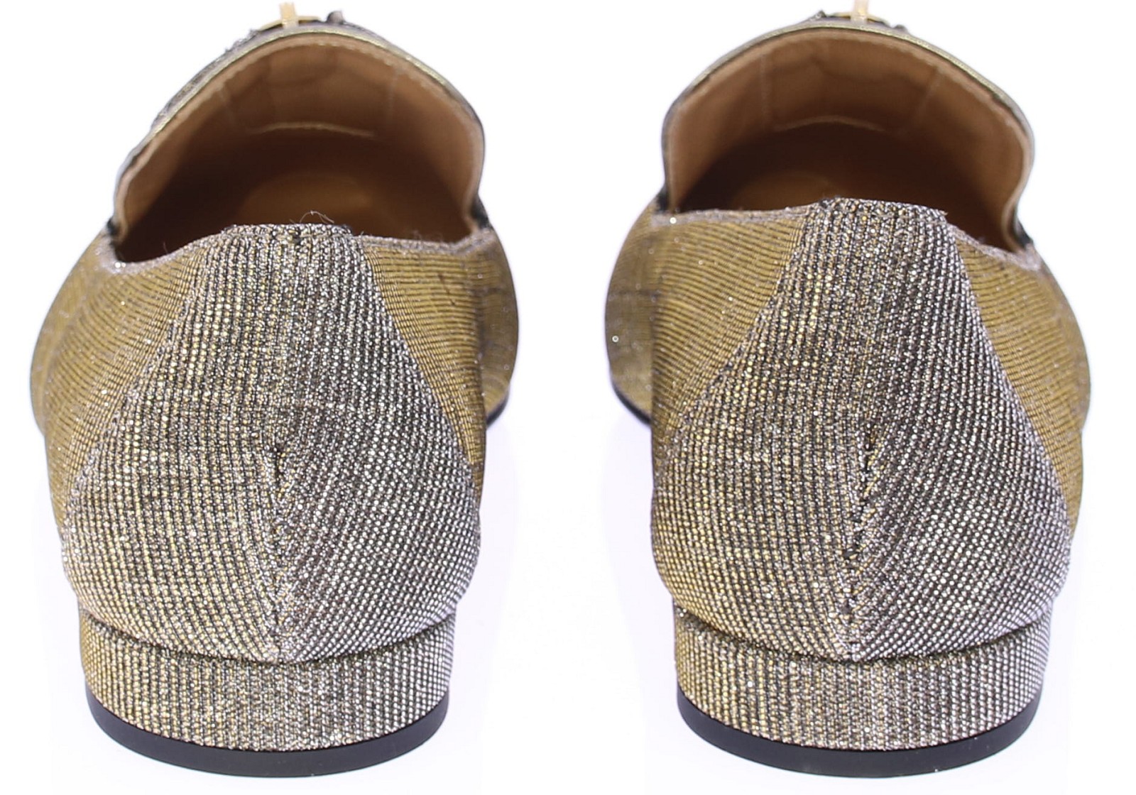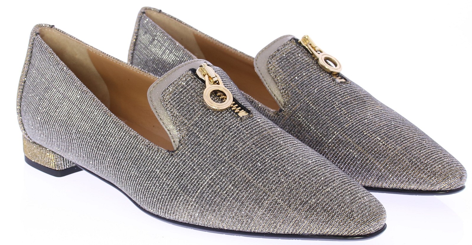 Gold-colored fabric women's loafer from Nalini. This stylish loafer combines elegance with a playful twist. Crafted from gold-colored glitter fabric with bronze leather accents, it features a leather lining and a rubber sole. The gold-colored decorative zipper on the instep gives the shoe a playful and luxurious look. Perfect for those who want to combine style and comfort in one shoe.