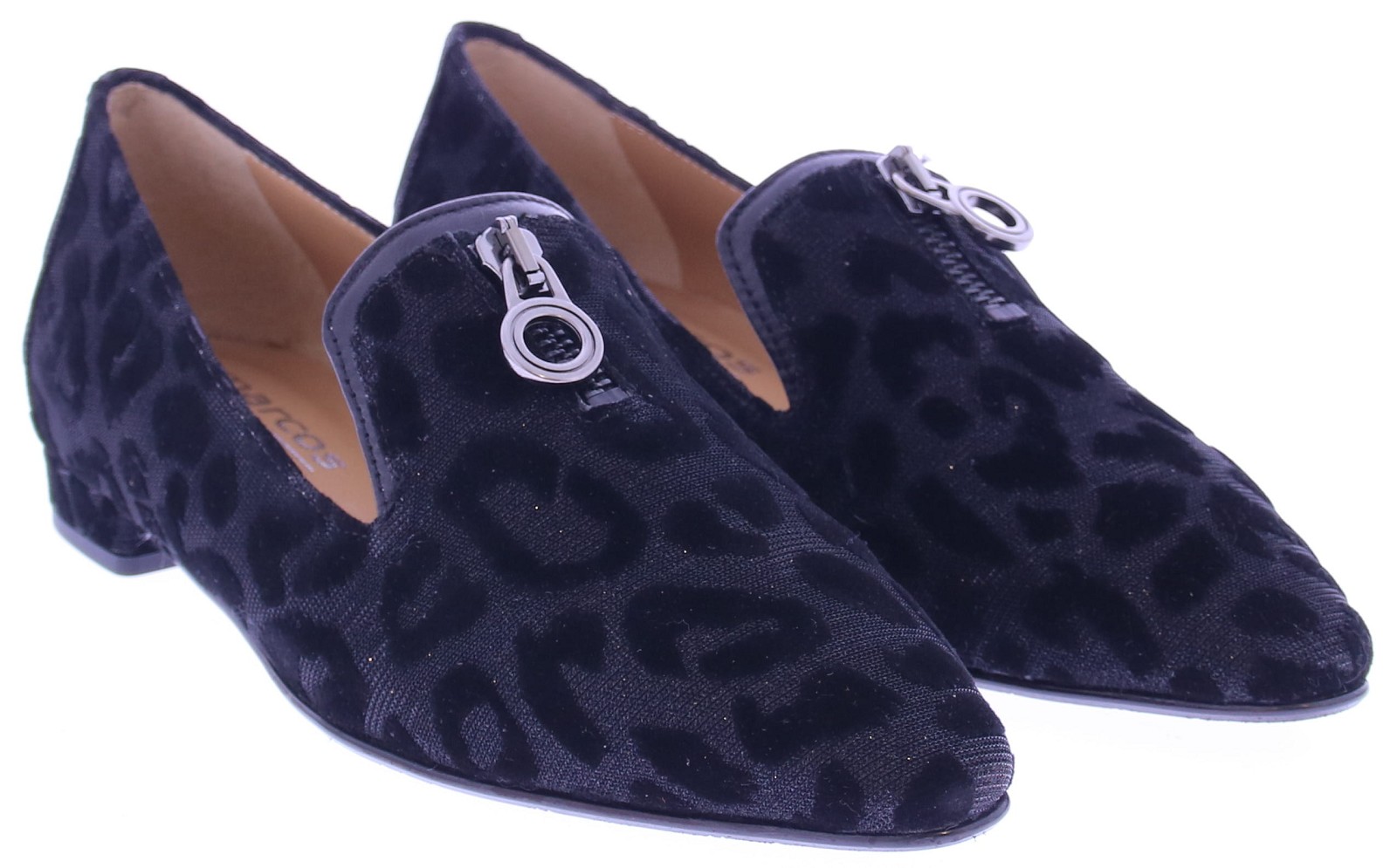 Black fabric women's slip-on from Nalini. This stylish loafer combines elegance with a playful twist. Crafted from a soft, black glitter fabric with a subtle velvet leopard print and leather accents, it features a leather lining and a rubber sole. The gold-colored decorative zipper on the instep gives the shoe a playful and luxurious look. Perfect for those who want to combine style and comfort in one shoe.
