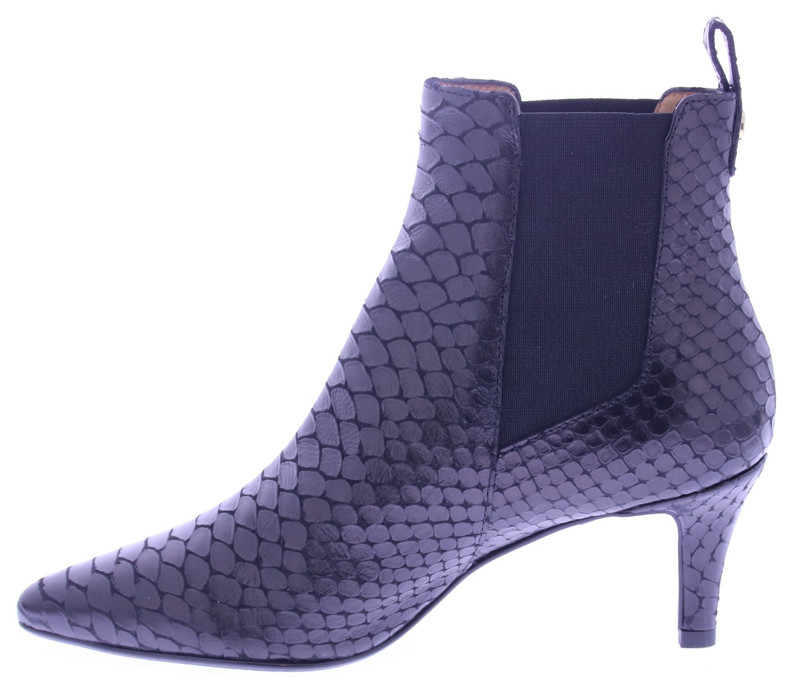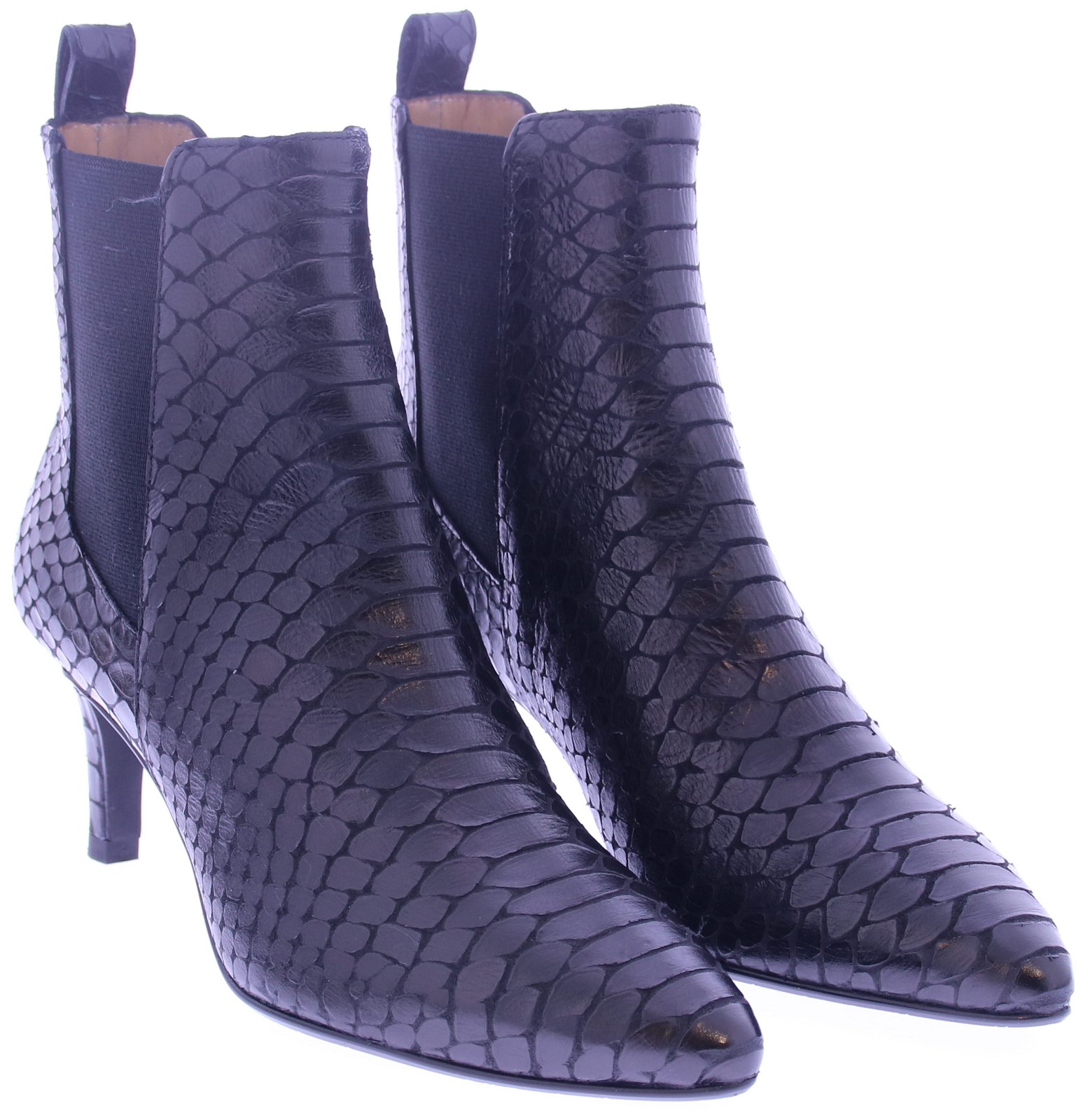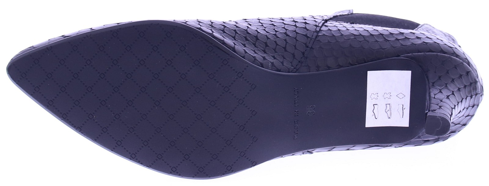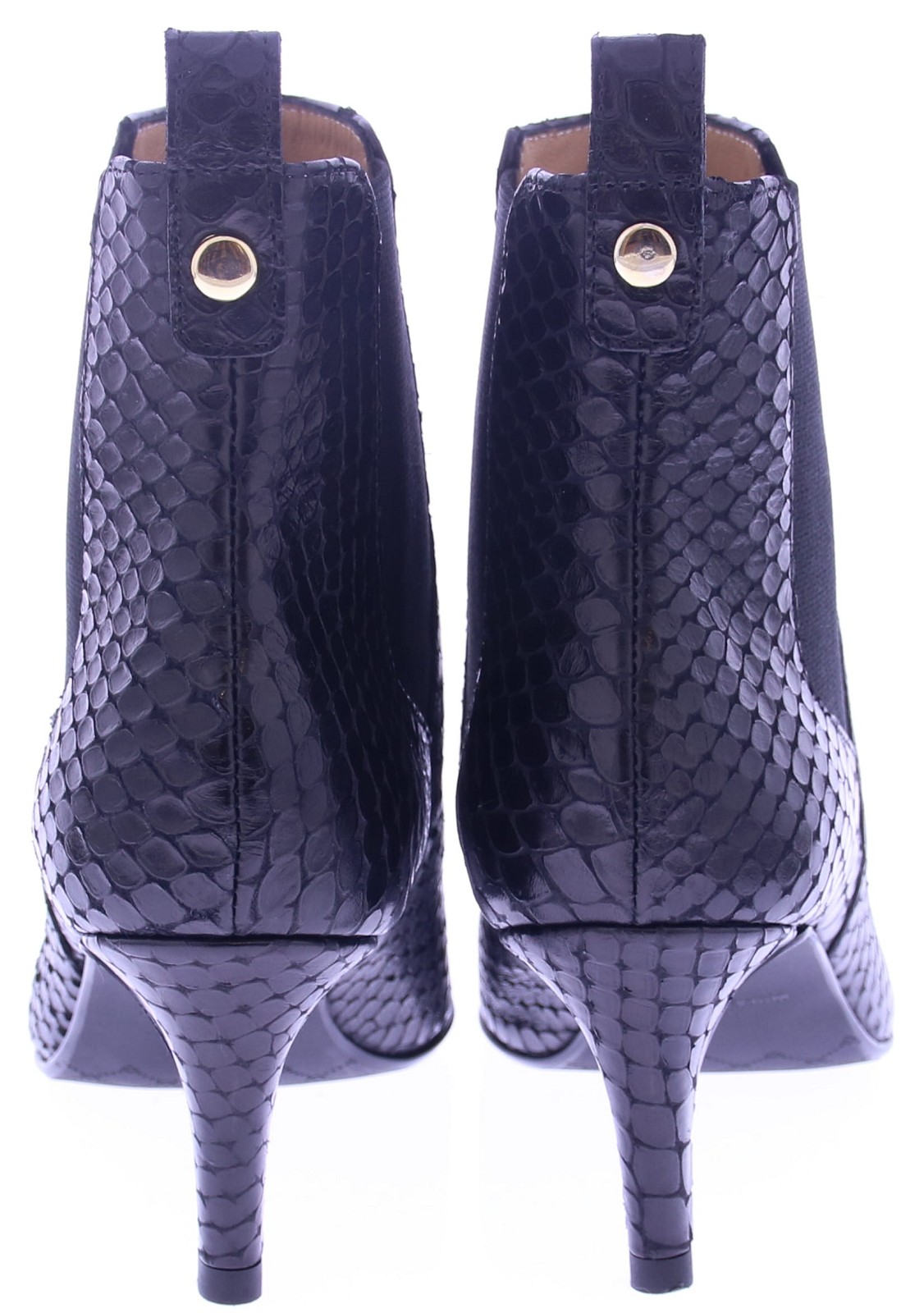 Black leather ankle boot from Nalini. Crafted from luxurious Italian calf leather with a snakeskin print. This short boot features an elegant pointed toe and a beautiful, slim 6cm heel, making it ideal for both business attire and a night out. Elastic side panels make slipping on easy, while the snug fit ensures a feminine look.