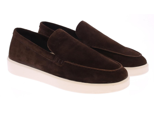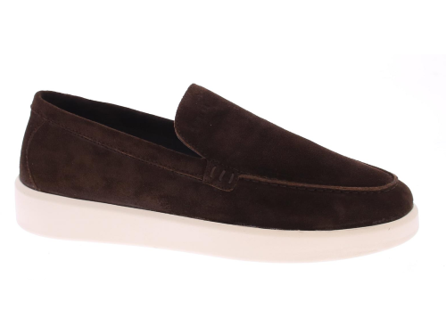 Dark brown suede men's slip-on from Nubikk. Features a sporty white sole and a removable footbed.