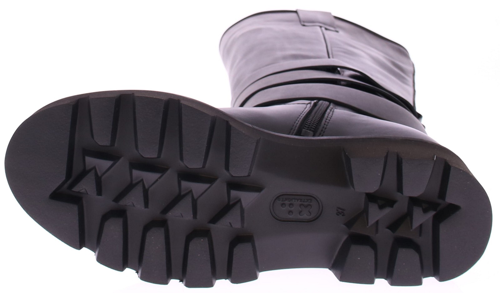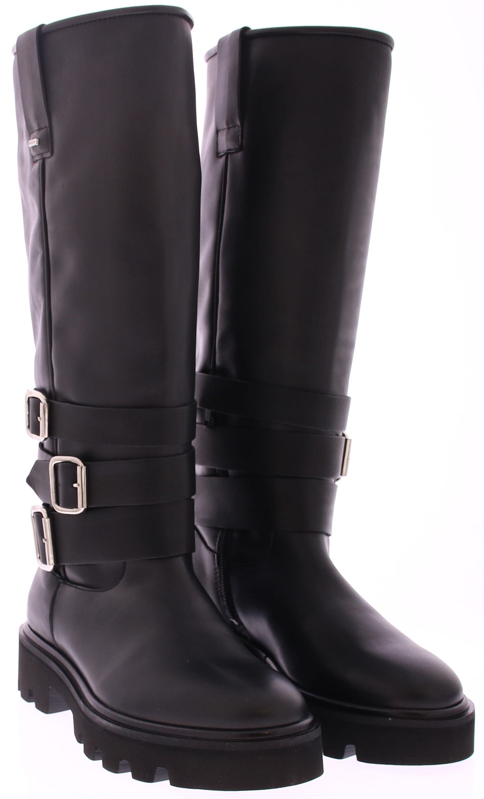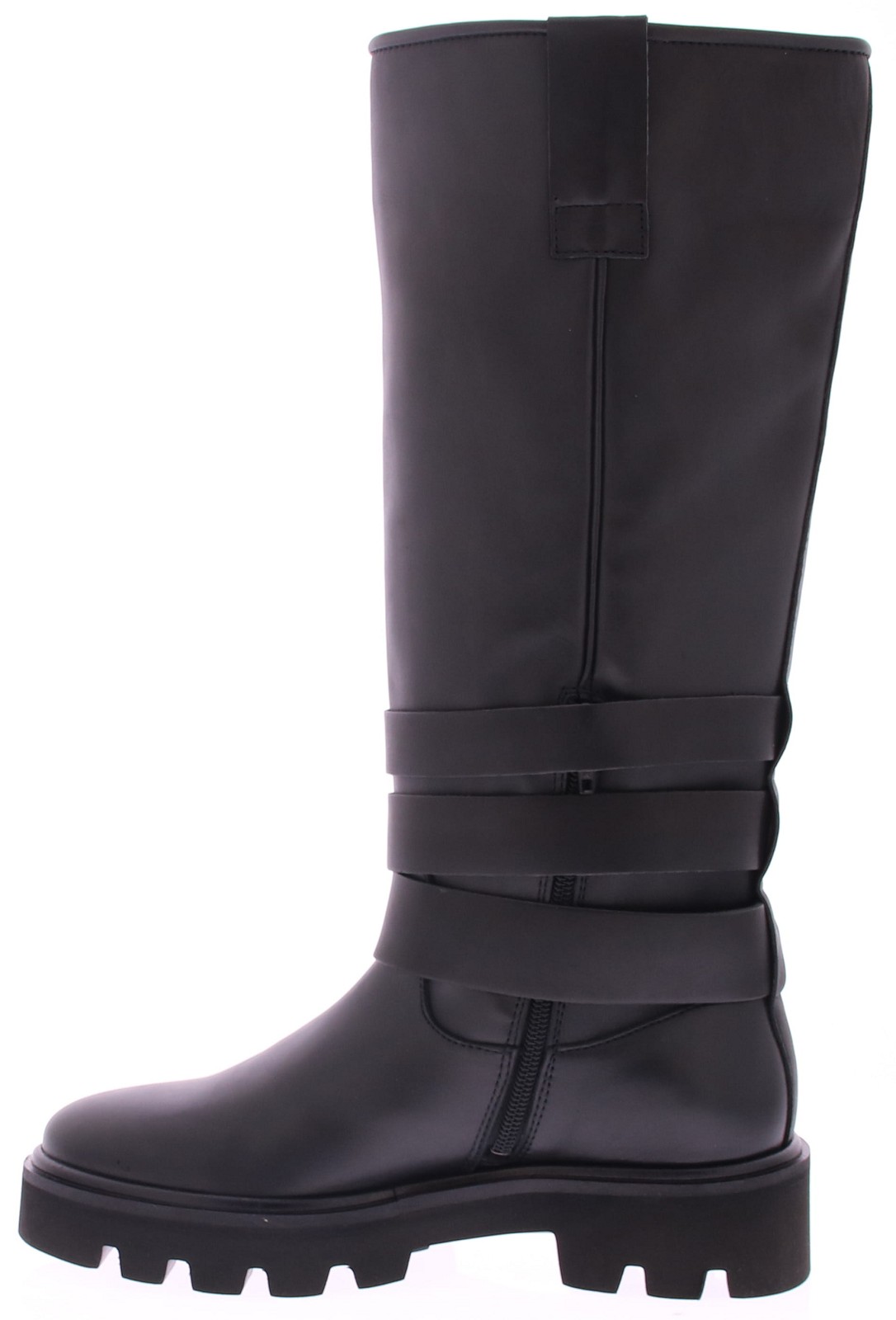 Black leather tall boot from Nubikk. The boot features three black leather ankle straps with silver buckles, creating a rugged look. The ¾ zipper on the inside makes slipping on easy and comfortable. The chunky rubber sole provides extra grip and stability with every step.