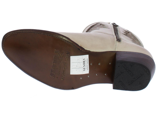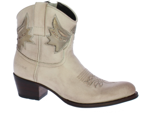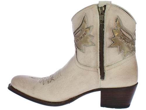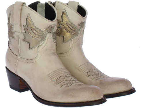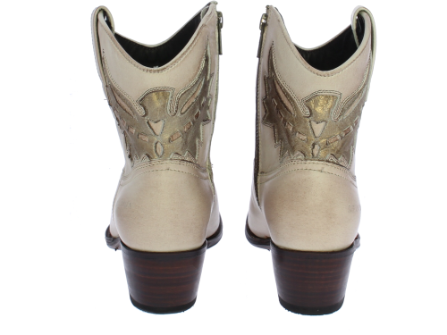 Sand with gold "vintage" look leather women's ankle boot by SENDRA. By cutting and shaping the leather, embroidering or piercing each motif, each Sendra boot gets its own identity. This short boot with round toe is made of leather. With an eagle on the shaft in matt gold. Has a pull tab on the outside to make it easier to put on and take off. The interior is made entirely of leather. Furthermore, this model has a flexible outsole and the heel measures approximately 4 cm.