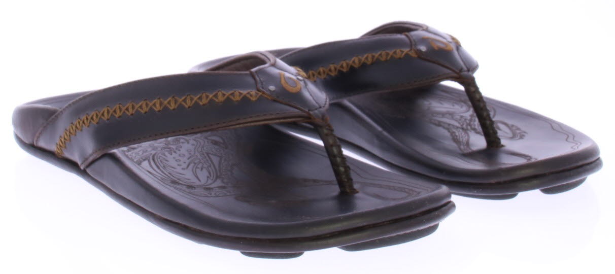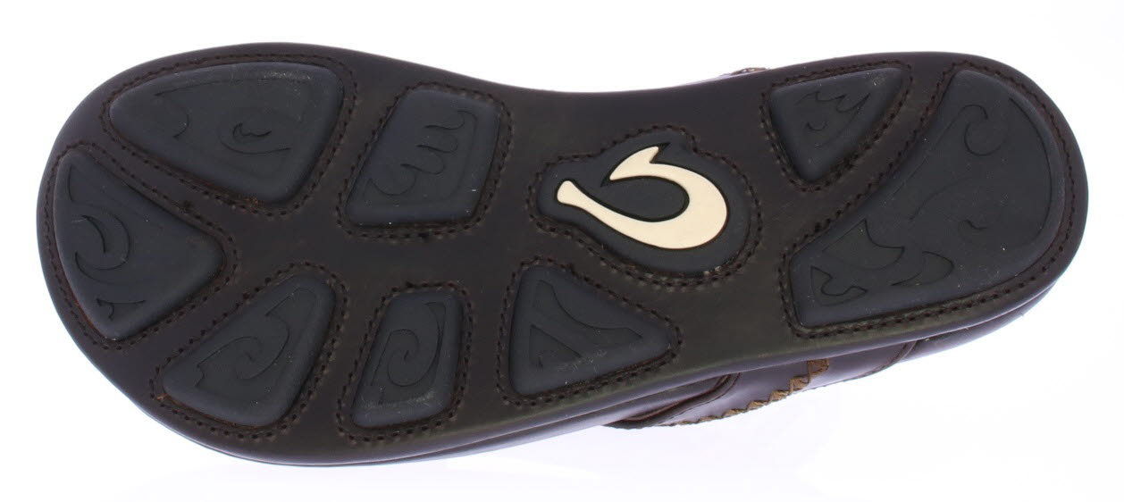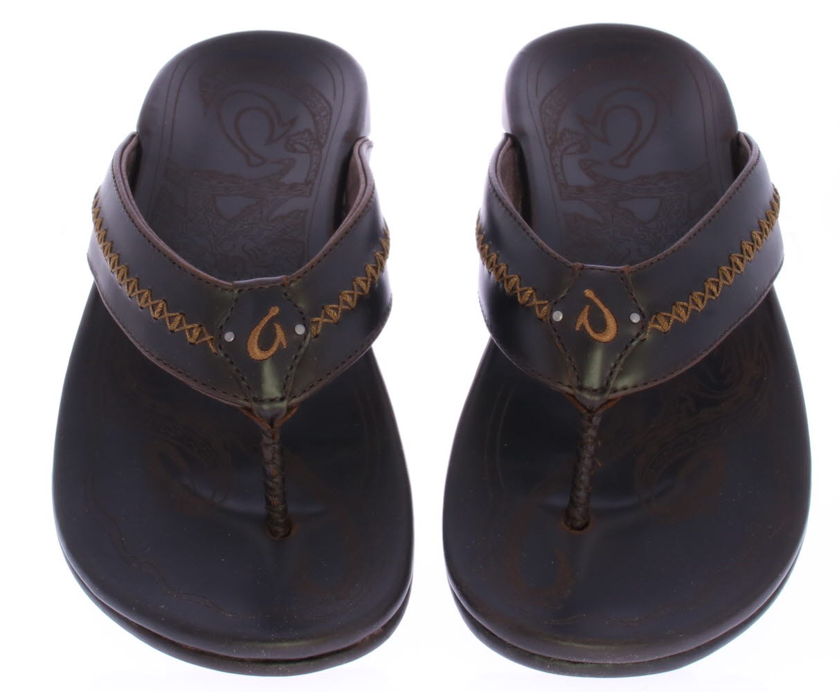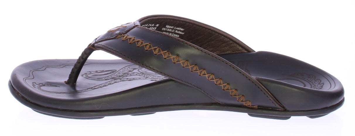 Dark brown leather men's slipper from Olukai. The Olukai brand follows nature's design, which offers anatomical support of the forefoot and provides stability and support.