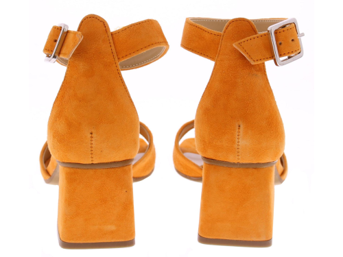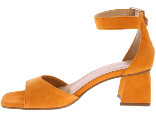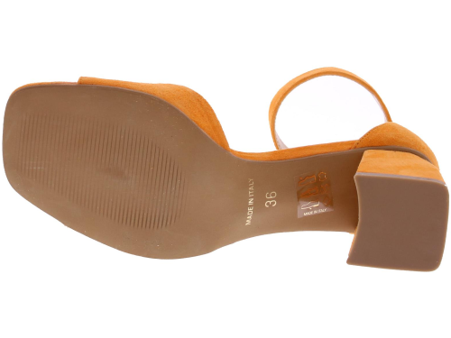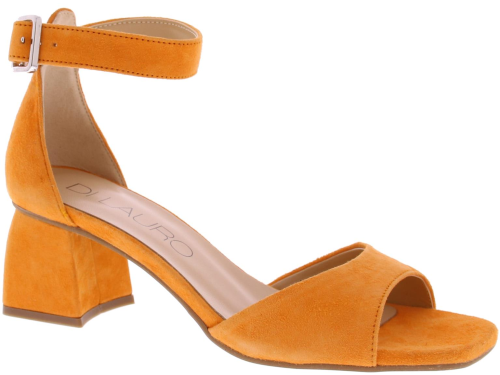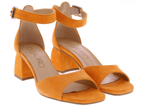 Light orange suede women's sandal by Di Lauro. This sandal has a wide strap over the toe, a rounded square last with a closed heel and adjustable ankle strap. This sandal has a heel height of 5 cm, and an adjustable strap around the ankle.