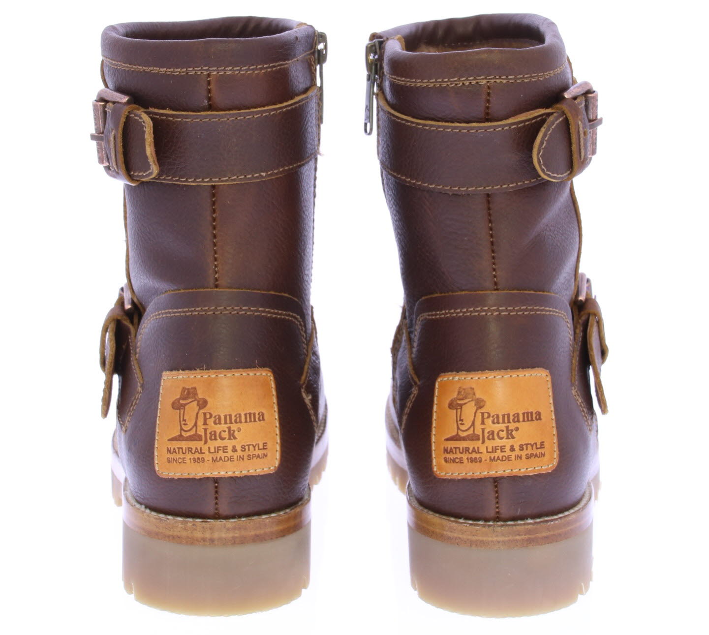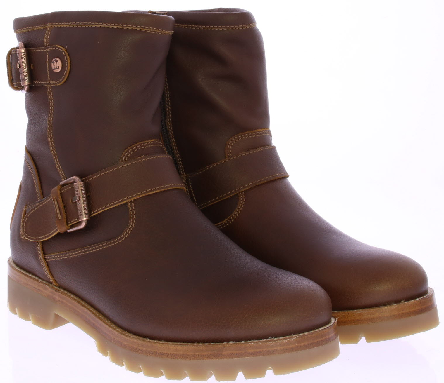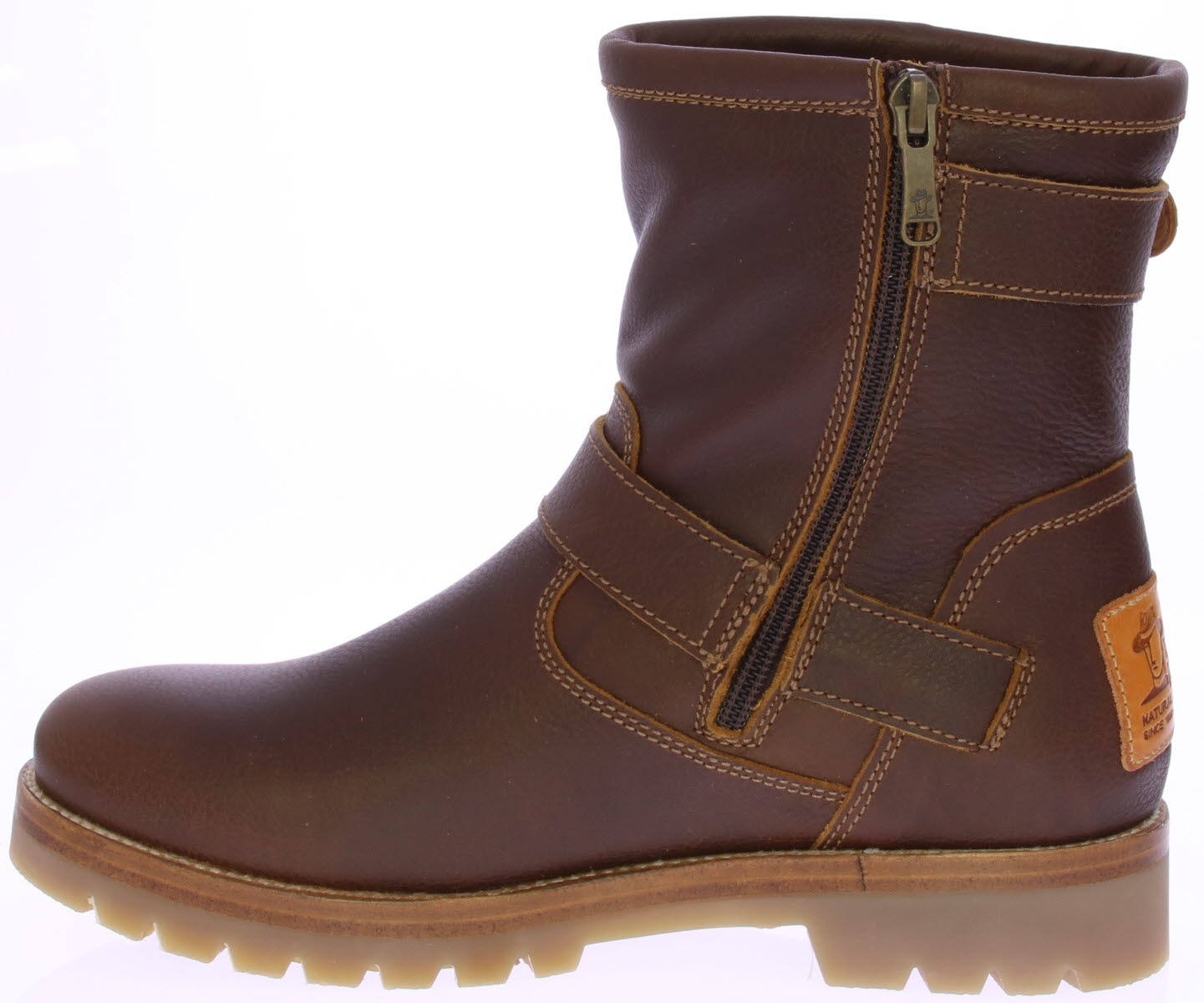 Dark brown greased leather women's boot from Panama Jack. This sturdy motor boot features two large buckles on the shaft and is fully lined with wonderfully warm sheepskin.