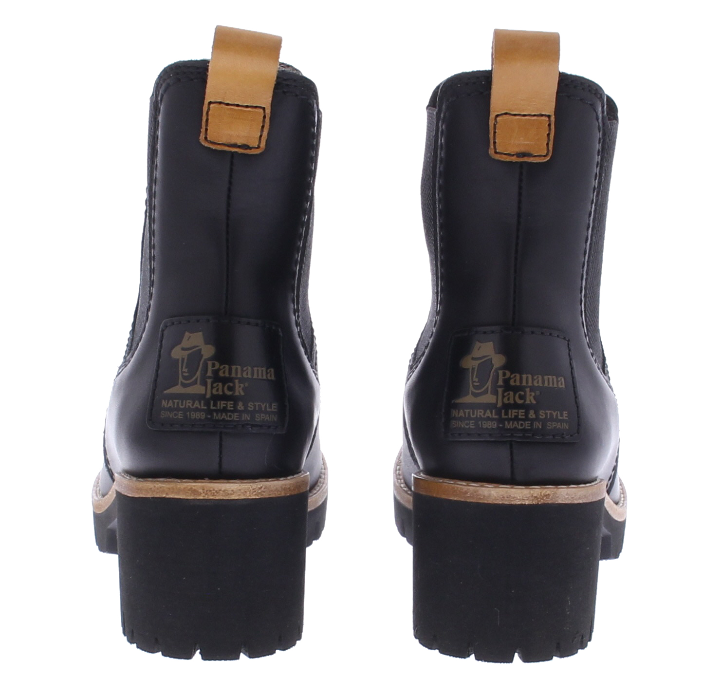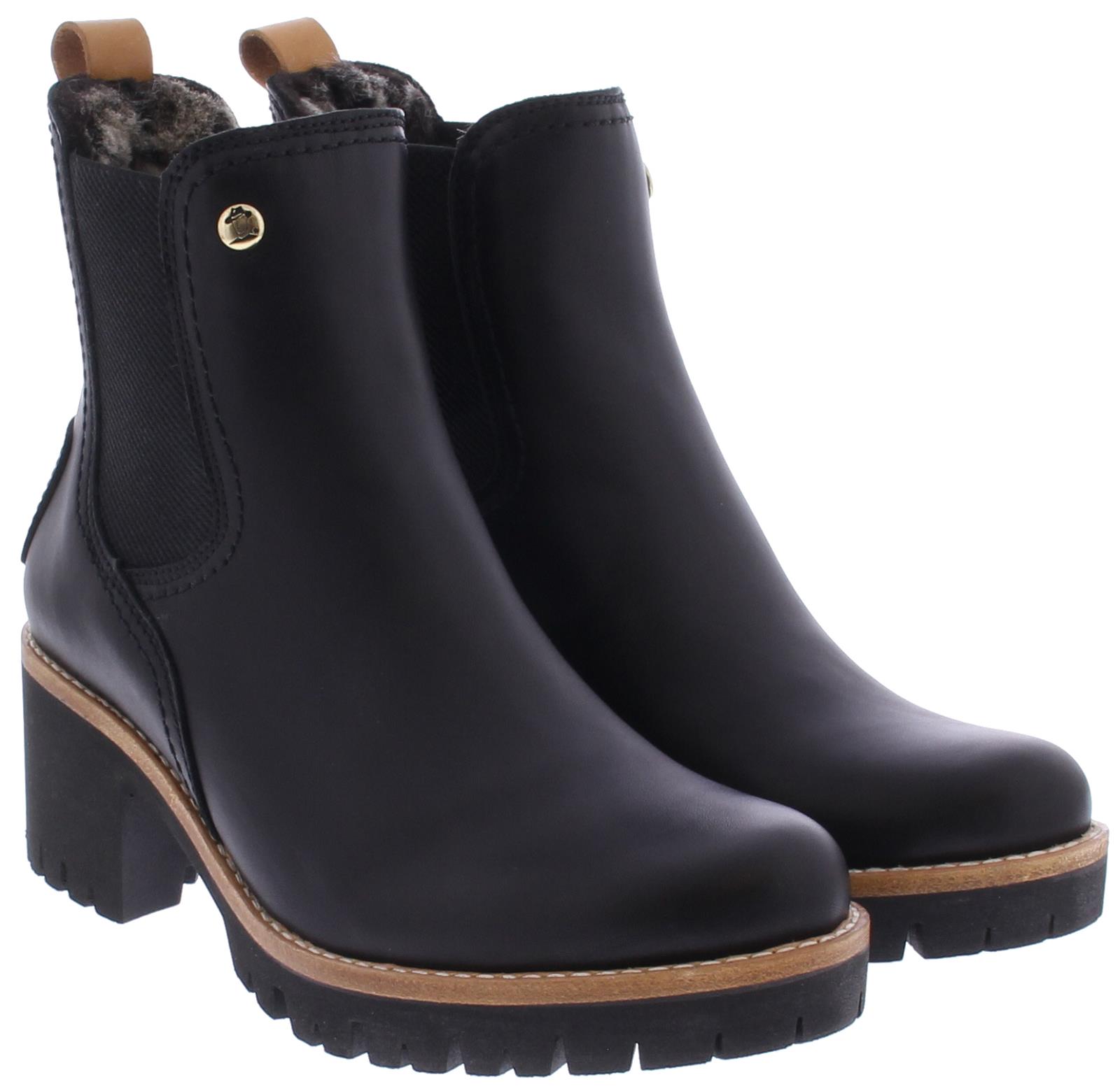 Black leather Chelsea women's boot by Panama Jack. The lining is made of imitation fur, making these boots wonderfully warm and comfortable. There is a loop at the back to make the boots easier to put on. The rubber heel height is 5 cm.