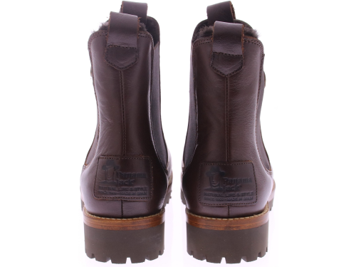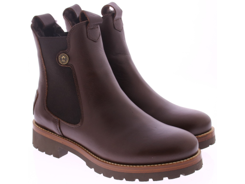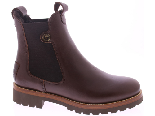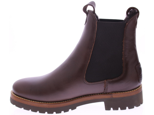 Dark brown leather women's boots from Panama Jack. These sturdy and feminine boots are crafted from high-quality brown leather and effortlessly combine comfort with fashion. The elastic sides ensure a flexible fit, while the convenient pull-on loops make them extra easy to slip on. The soft sheepskin lining keeps your feet wonderfully warm on cold days. The striking, lightly stitched sole gives the boot a cool and contemporary look. The footbed is removable, and the rubber sole has a coarse tread.