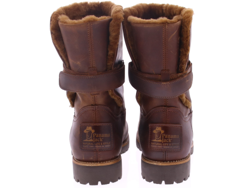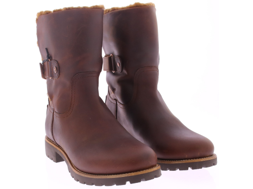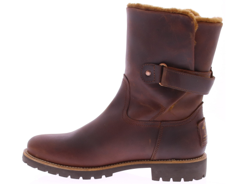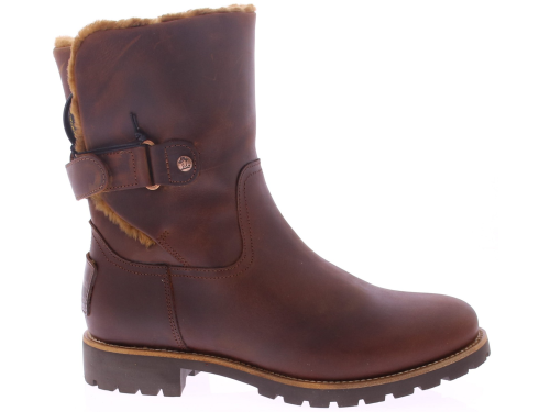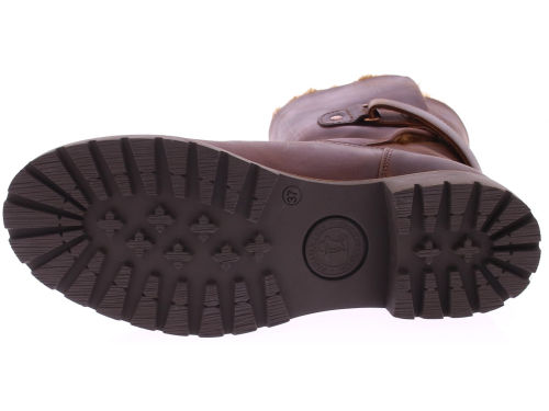 Brown women's boots from Panama Jack. These boots are made of brown greased nubuck and have a round toe. The hook-and-loop closure ensures a secure and adjustable fit, making them perfect for everyday wear. The soft sheepskin lining keeps your feet wonderfully warm in winter. The insole is replaceable with your own custom insole. The outsole is rubber and has a coarse tread for better grip.