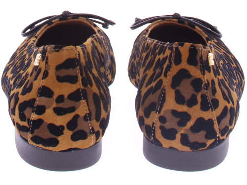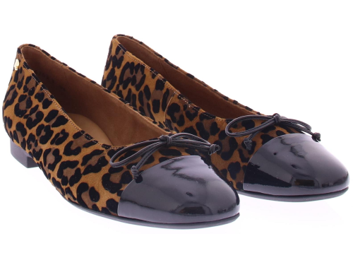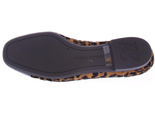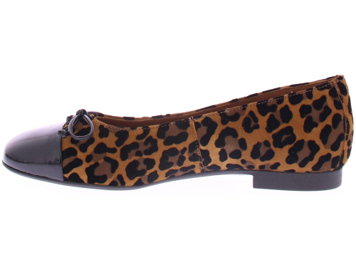 Beige and black leopard print leather women's ballerina flats from Paul Green. The toe is trimmed with black patent leather and decorated with a subtle bow. The flats have a lightweight leather lining and a rubber outsole. The heel height is 2 cm.