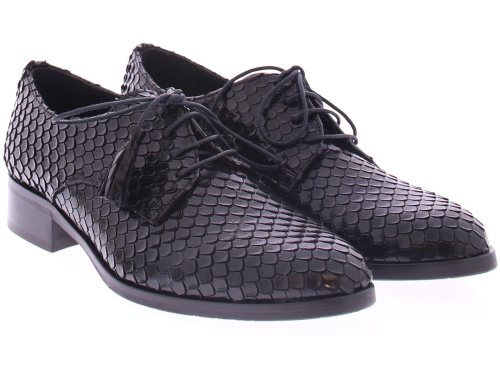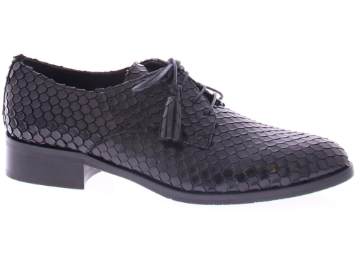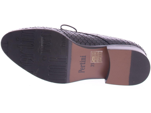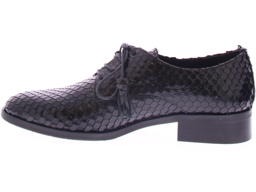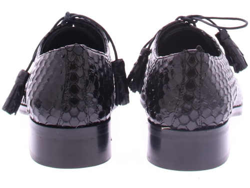 Black snake print lace-up shoe from Pertini. The addition of tassels to the laces gives the shoe a playful and refined detail. This shoe features a 2 cm block heel that offers just enough height to give you an elegant look while still being easy to walk on. The lining is leather and the sole is rubber.
