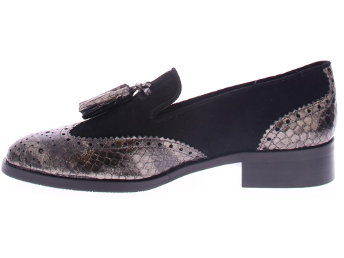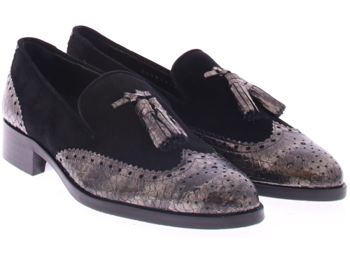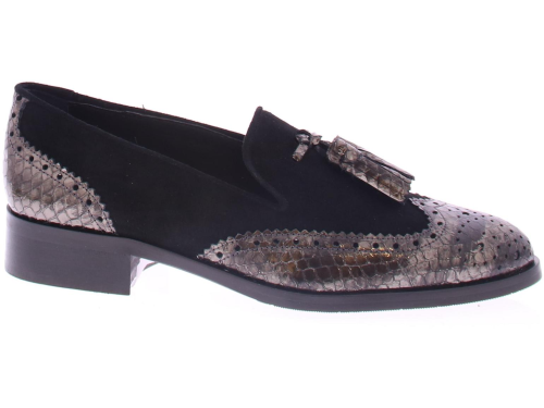 Black suede women's loafer from the Pertini brand. This loafer is made of supple suede and has a decorative brogue toe with matching perforations in leather. A nice detail is the leather tassel on top of the instep. The interior of the shoe is made of leather and has a fixed footbed. The leather sole has a rubber finish and a layered heel with a height of approximately 2 centimeters.