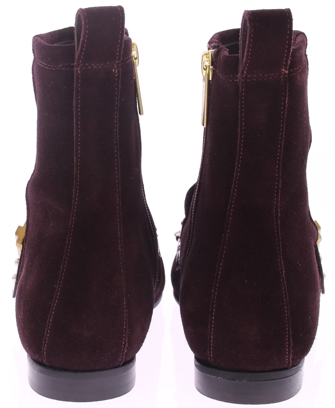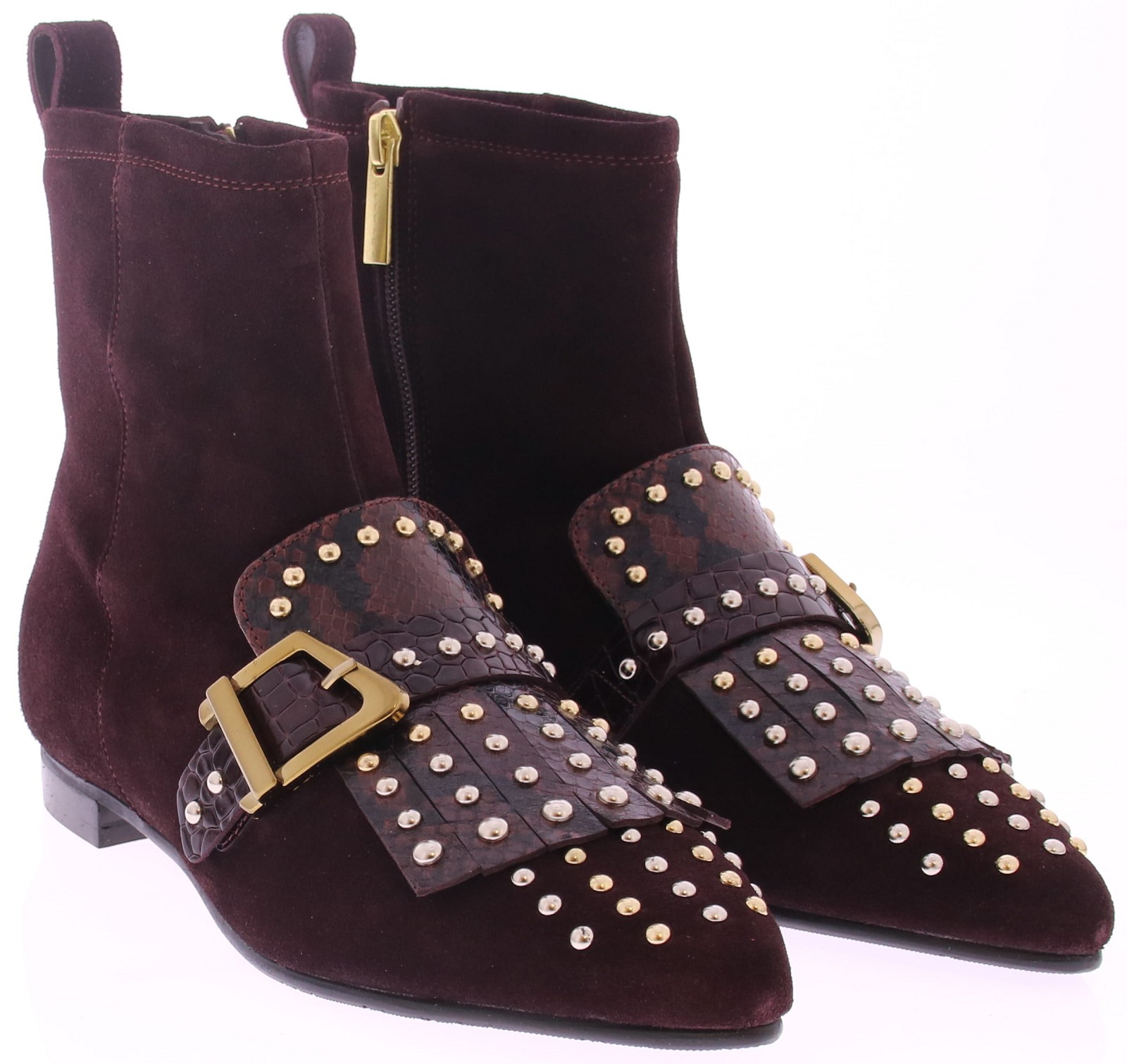 Bordeaux suede and leather short women's boot from Pertini. This Pertini boot is a striking combination of materials, textures, and accents. Crafted from suede and leather, it features a striking jamboree flap, richly finished with gold and silver studs that extend across the instep and strap. An interior zipper makes it easy to put on and take off, while the rubber sole and low 2cm heel ensure comfortable everyday wear. Bold, feminine, and meticulously crafted – a true eye-catcher with any outfit. NOTE: FITS SMALL.