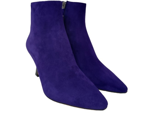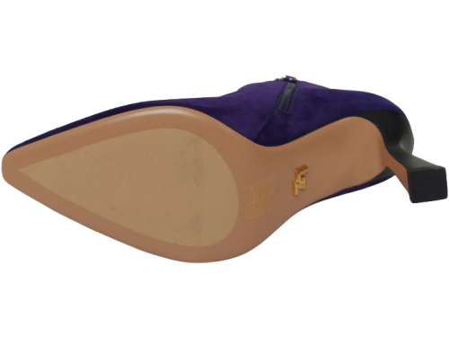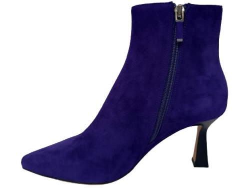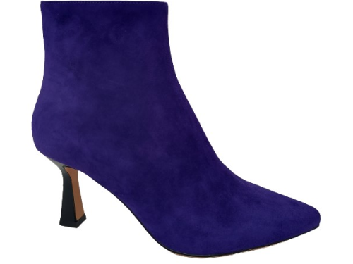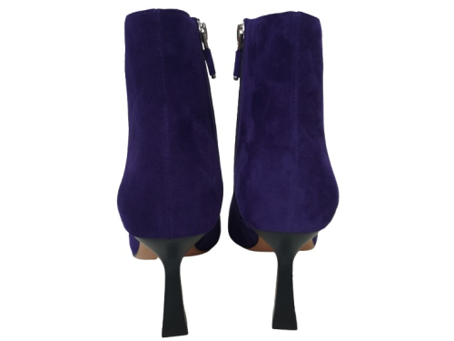 Bright purple suede women's ankle boots from Lola Cruz. Made on an elegant pointed last with a slightly inward 7 cm heel. The boot has a zipper and is lined with leather