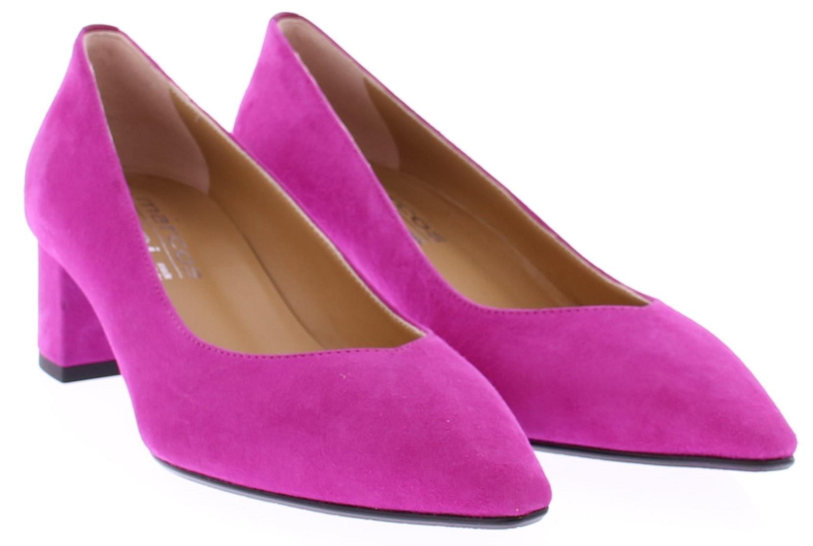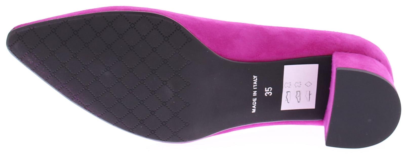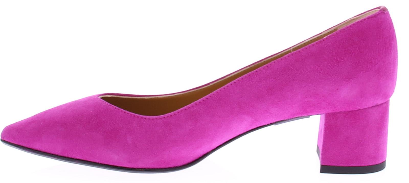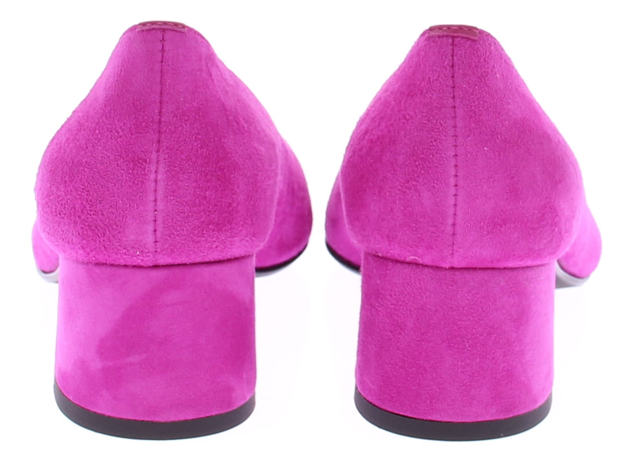 Fuchsia suede women's pump by Nalini. The covered, comfortable heel has a height of 4 cm. The V-cutout gives the pump an elegant look.