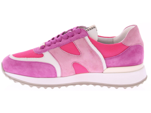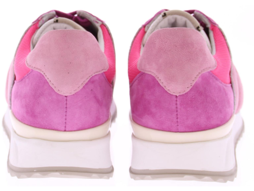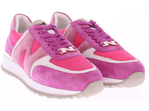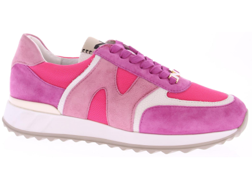 Fuchsia women's sneaker by Nathan-Baume. This sneaker with white accents on the sides is made of suede with fabric. The white sole has a ribbed pattern for a firm grip. The insole is removable. This sneaker is slightly wider.