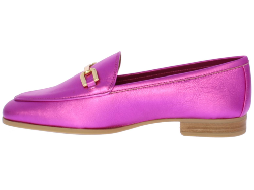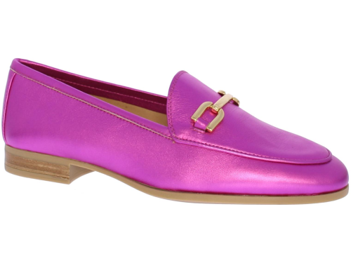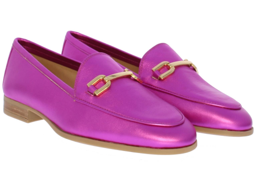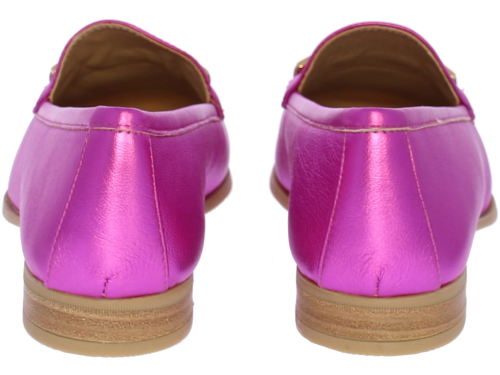 Fuchsia metallic leather women's loafer by Unisa. The loafer has a decorative gold-coloured bit on the instep. Thanks to the sole of smooth, but non-slip rubber and the heel with a heel height of 1.5 centimetres, this slim loafer is wonderfully comfortable. Wear it with a basic outfit and let your loafers steal the show!