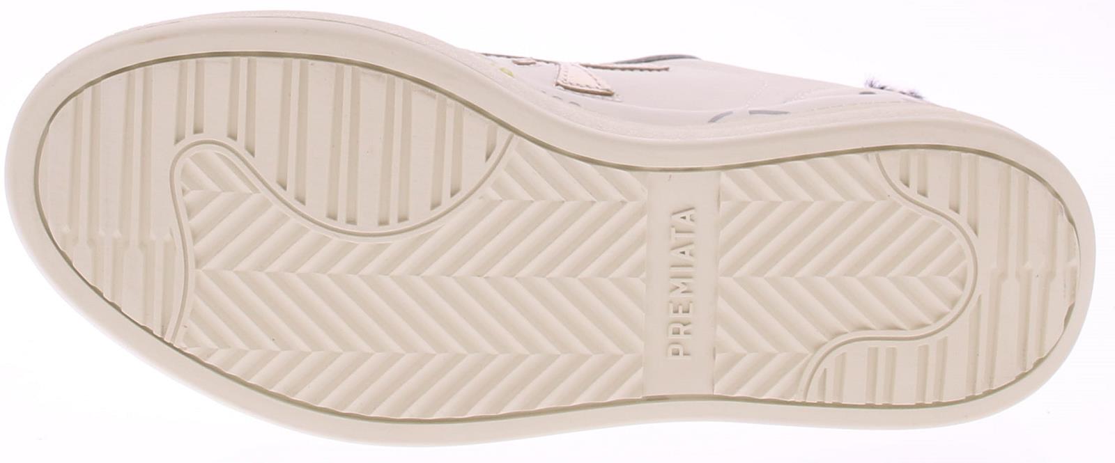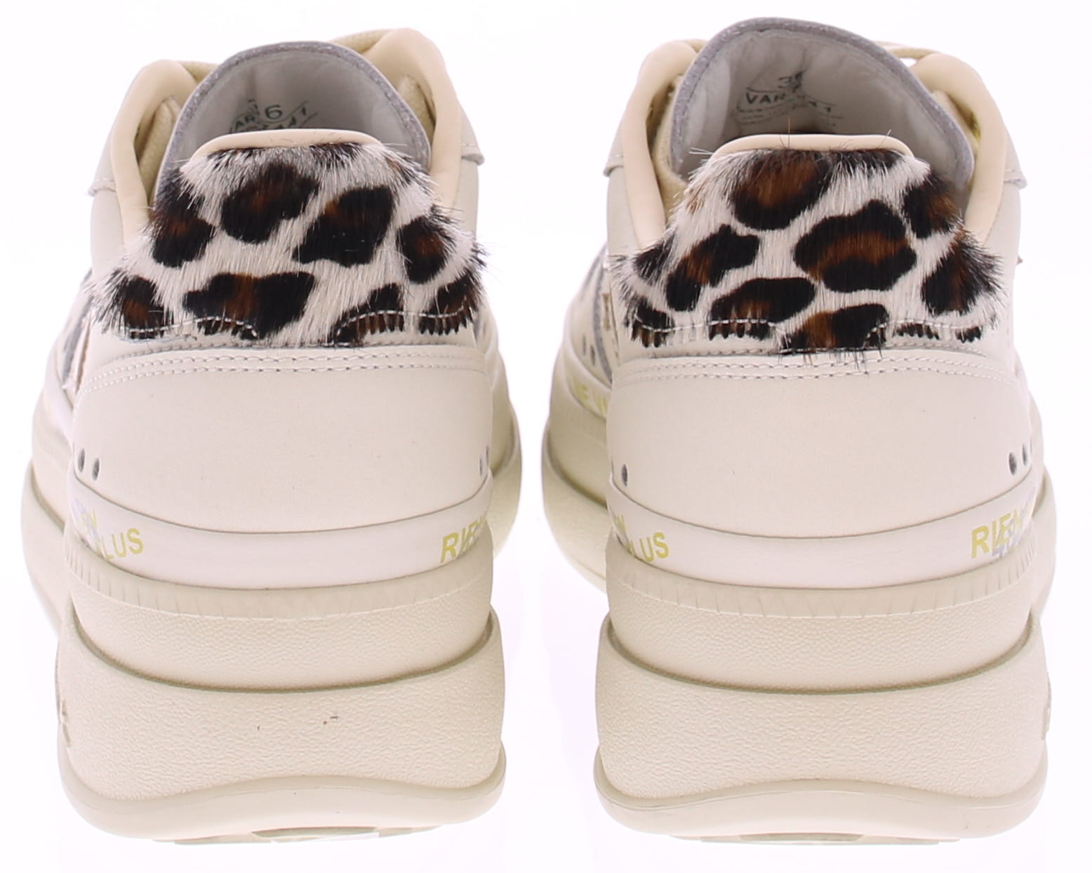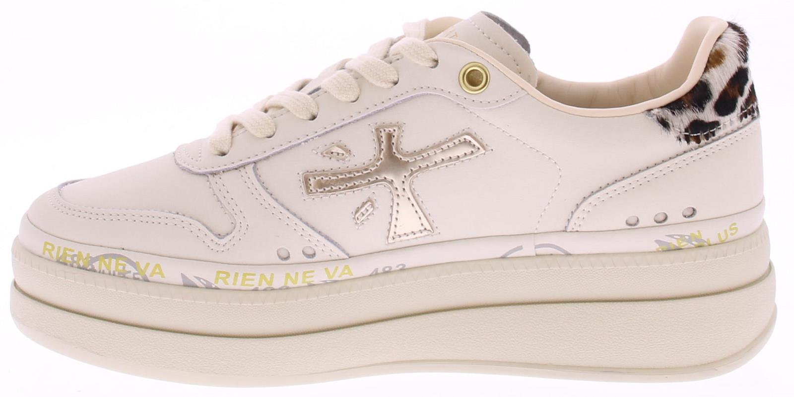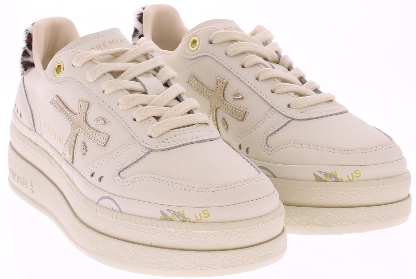 Premiata women's cream leather sneaker. These MICOL 7441 sneakers feature a cream leather and gold-tone faux leather upper, complemented by a leopard-print pony hair. The unique print on the sole edge, the approximately 5cm stacked rubber platform sole, the oversized perforations, and the gold eyelets are striking. Off-white cotton laces and branded details on the tongue, sole, and side panels complete the look.