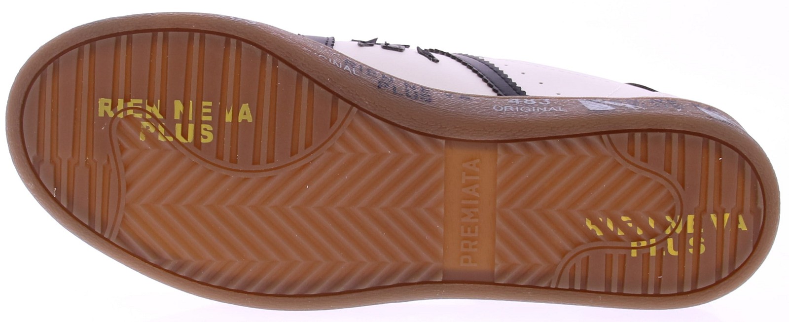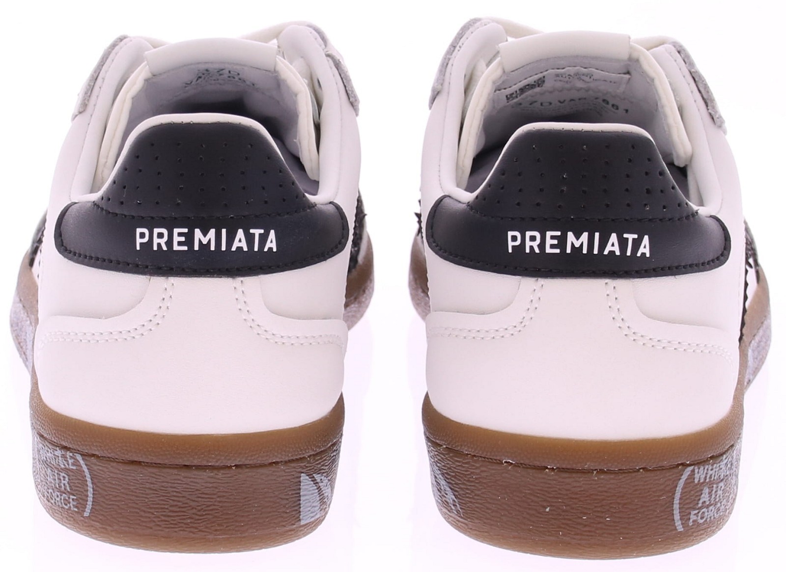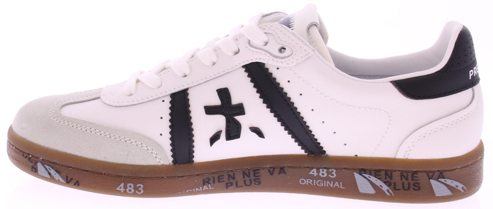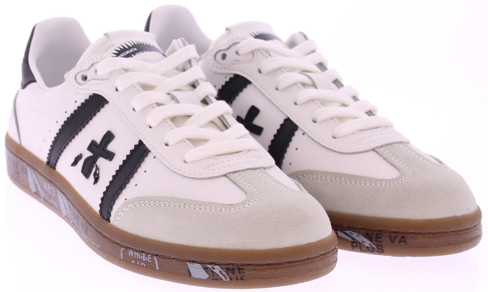 White leather women's sneakers from Premiata. The Premiata Bonnie 7861 is a sneaker that combines retro tennis style with contemporary Italian design. The white leather upper features black leather details and a light gray suede toe cap. This elegant, minimalist sneaker exudes class and sportiness – perfect for those who appreciate timeless design with a contemporary twist. The signature Premiata sole with "White Air" technology on a brown base provides comfort, stability, and a recognizable style. Ideal for wearing with wide-leg jeans or a casual outfit.