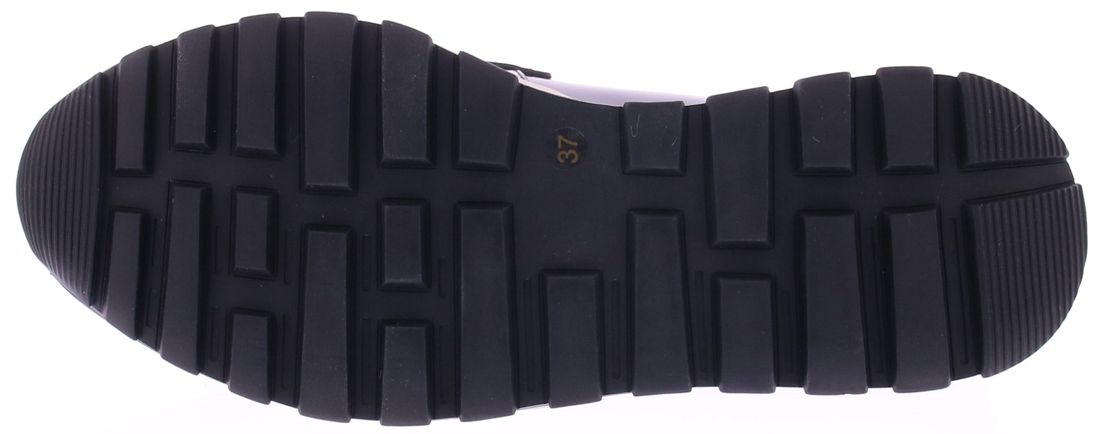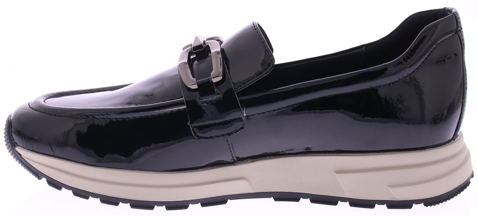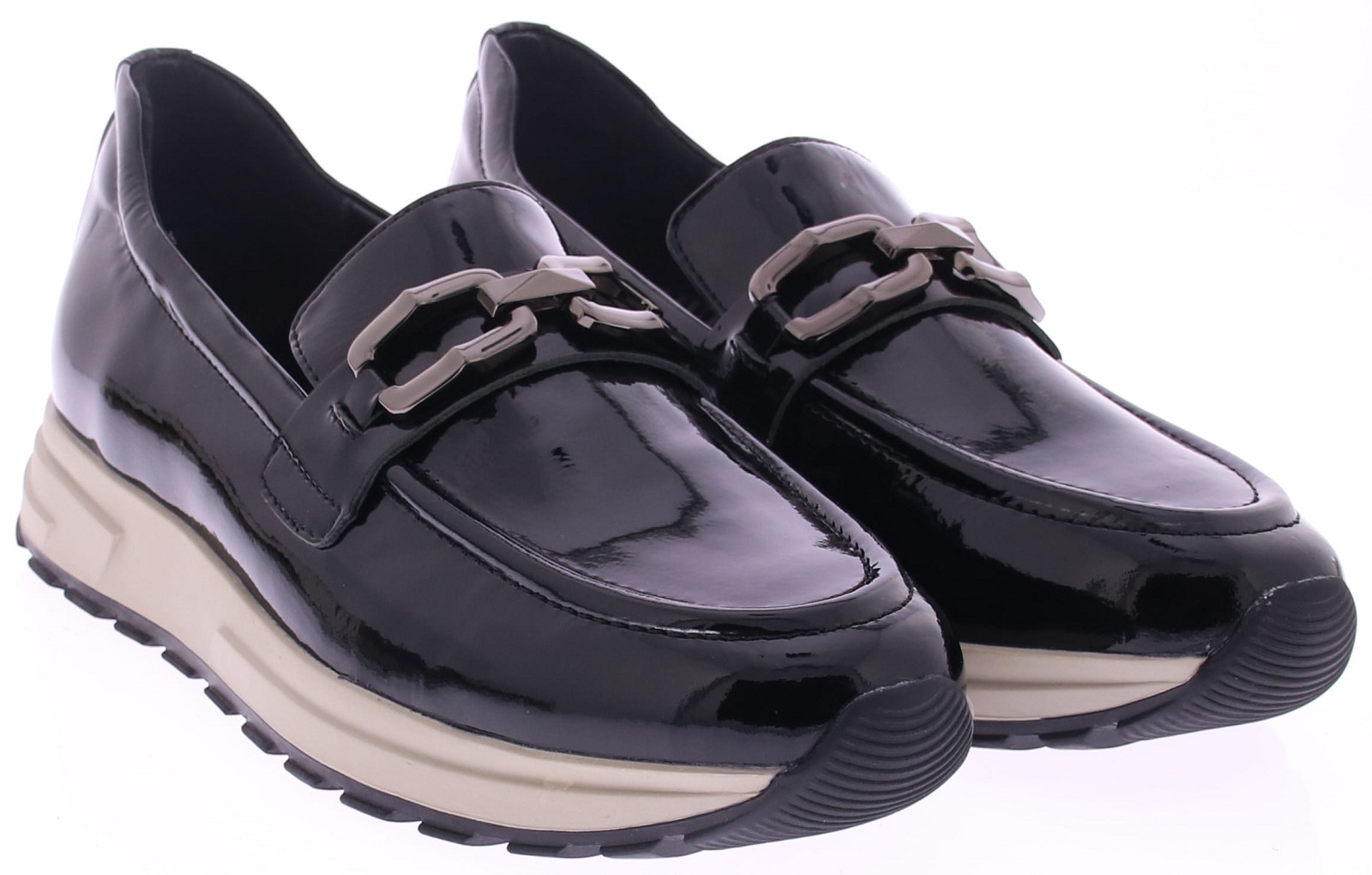 Sporty black patent leather women's loafer from Rapid Soul. The Yza is a trendy patent leather loafer with an anthracite metal toe cap and a sporty rubber sneaker sole for optimal grip.
