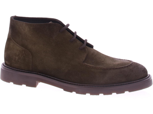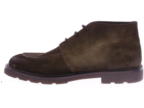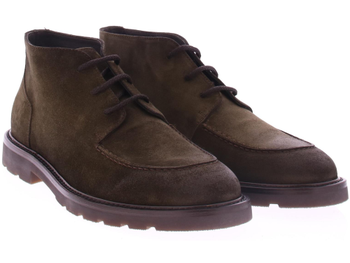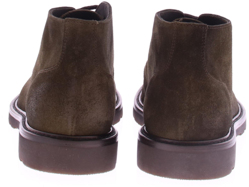 Men's ankle boot by Rossano Bisconti in green suede with a stitched seam over the vamp. The shoe has a lightweight rubber sole and leather lining.