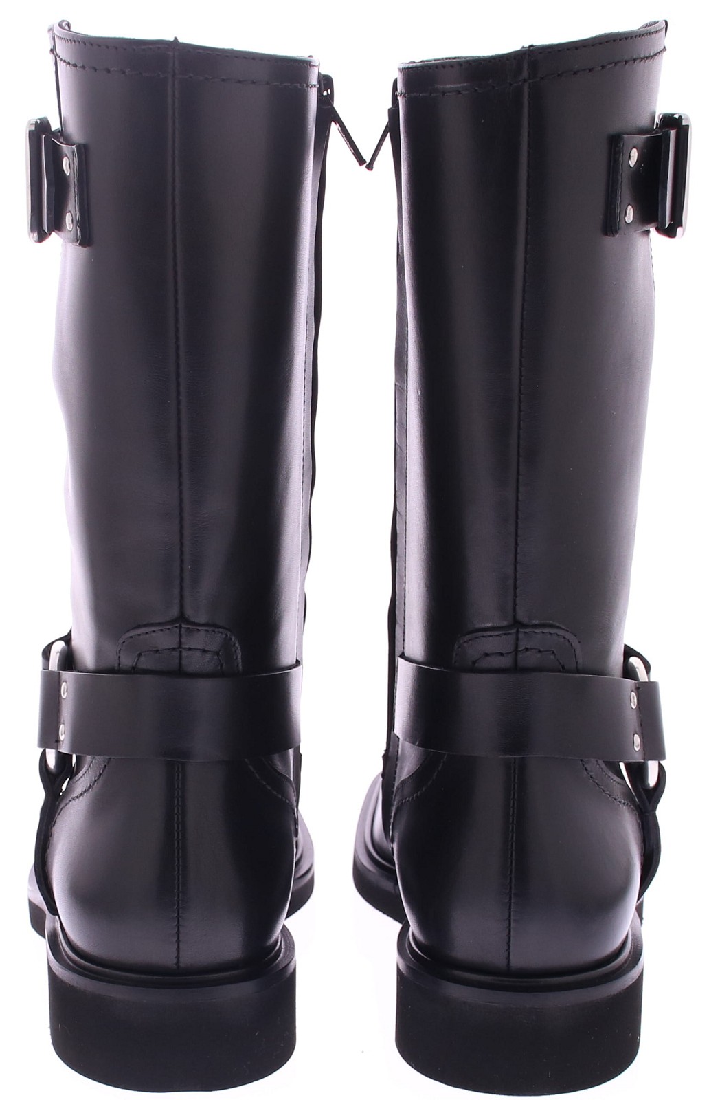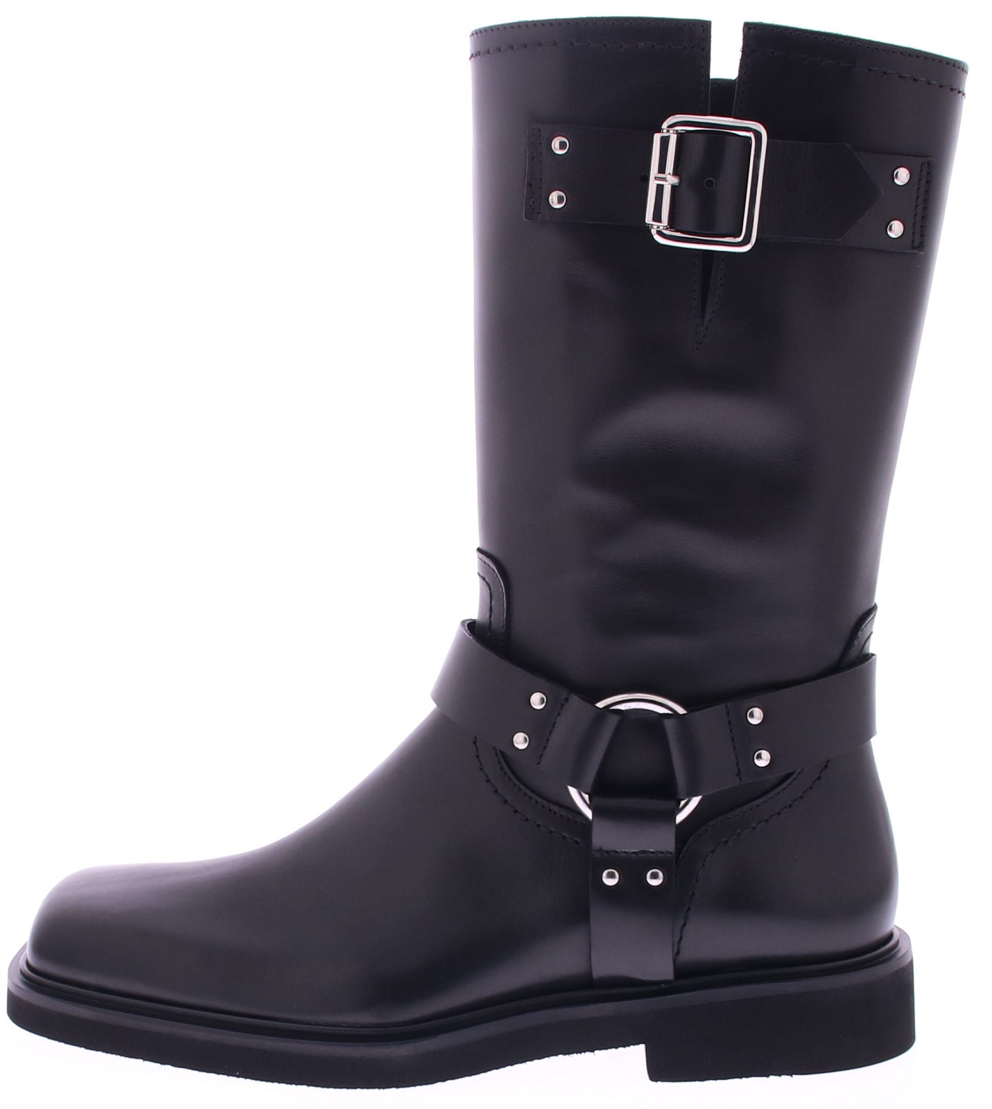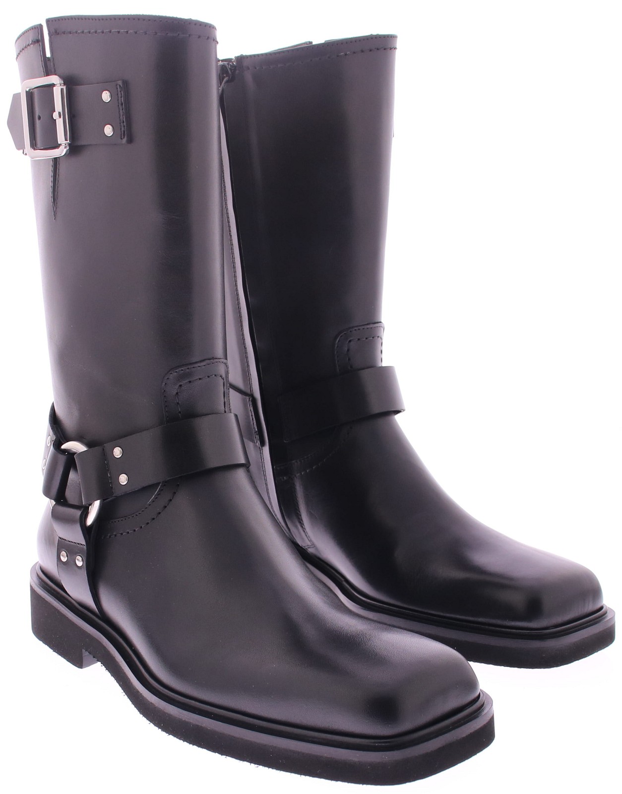 The Min Ranch by Guglielmo Rotta is a modern black leather women's motor boot with a rugged yet refined look. This boot features a stylish square heel and a striking ankle strap with rings. A narrow leather strap with a buckle fastens on the shaft, giving the boot a contemporary and feminine touch. The rubber sole provides durability and comfort, while the slightly shiny leather gives the boot a luxurious look. The combination of rugged details and an elegant fit makes the Min perfect for both casual and formal outfits – a true statement boot for any occasion.