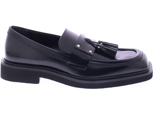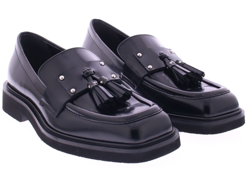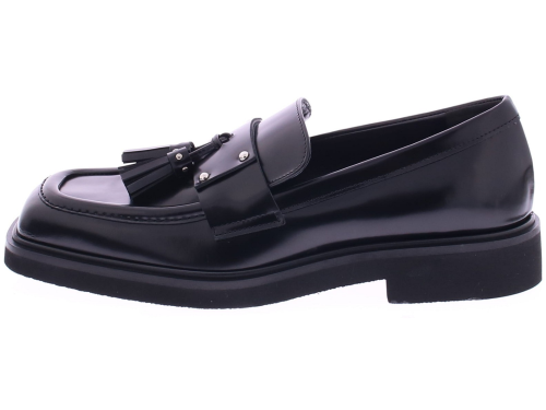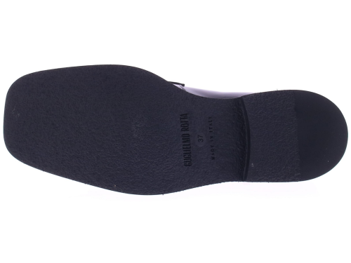 Black leather women's loafer from Rotta. The Micol model features a stylish square design with a tasseled strap across the instep. The rubber sole and glossier leather make it a true fashion statement.