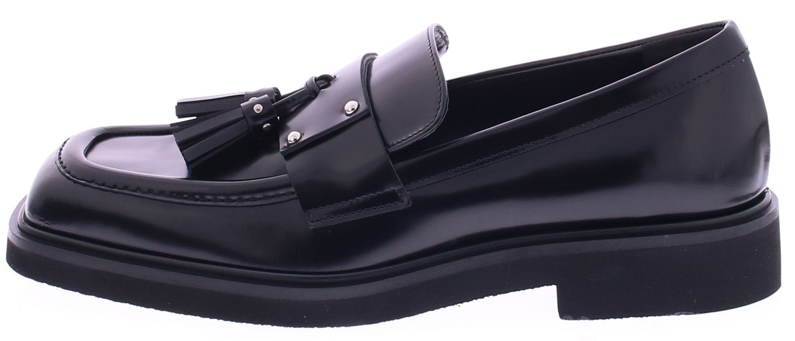 Black leather women's loafer from Rotta. The Micol model features a stylish square design with a tasseled strap across the instep. The rubber sole and glossier leather make it a true fashion statement.