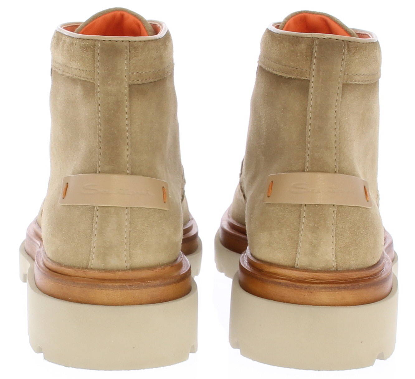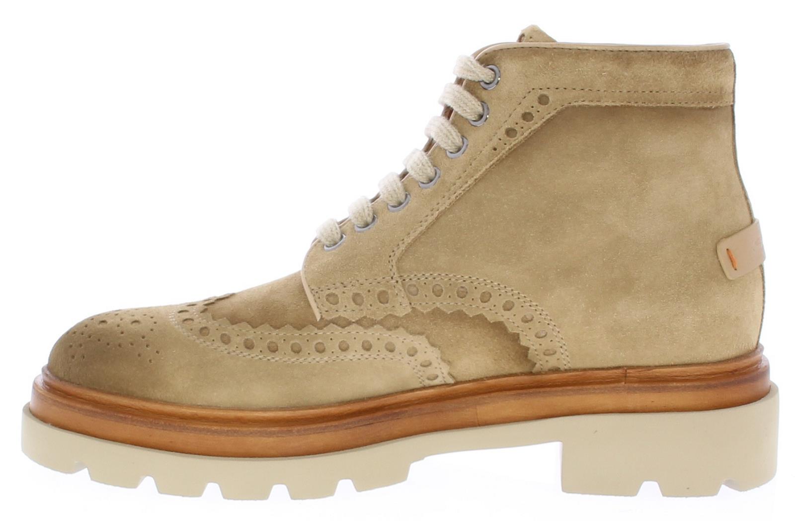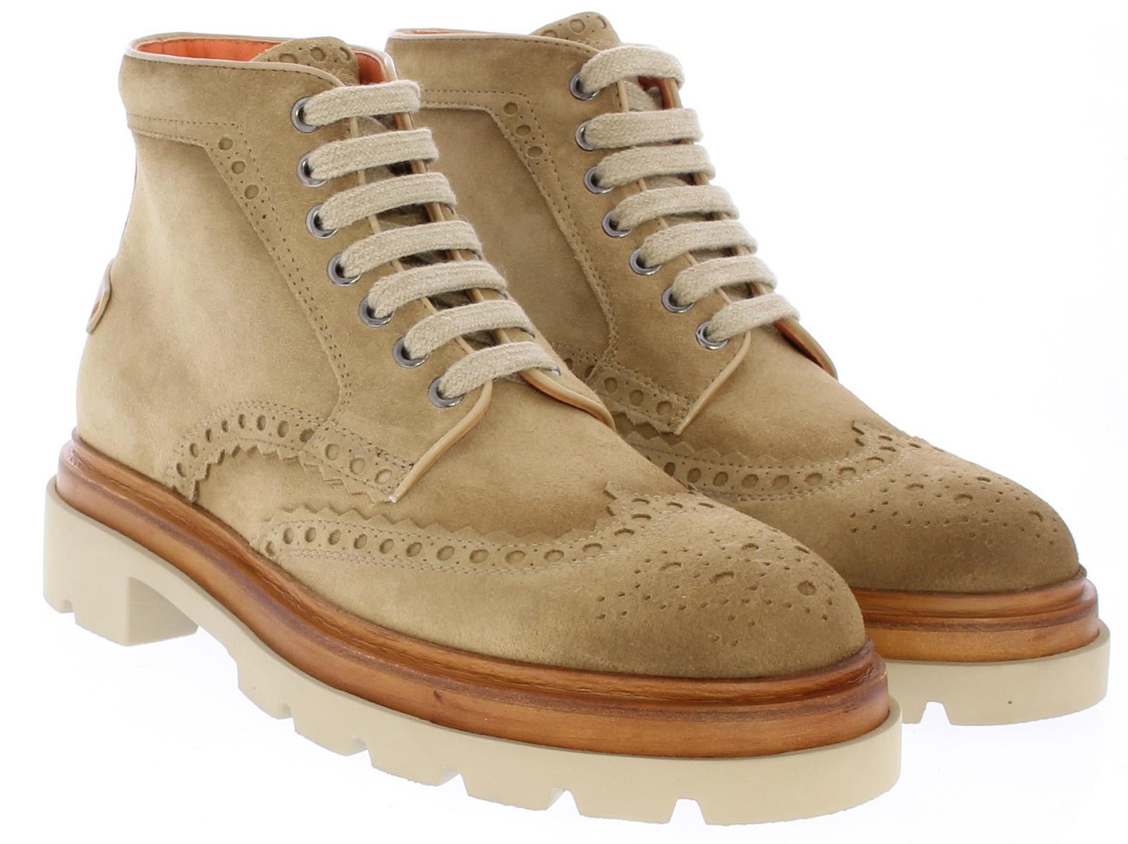 Sand-colored suede men's lace-up boots from Santoni. These brogue-style boots come with a white, chunky sole and are lined with leather.