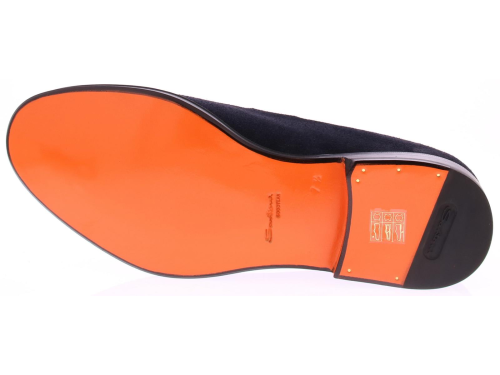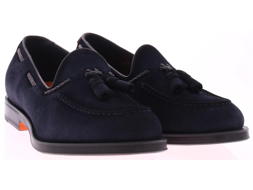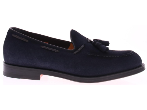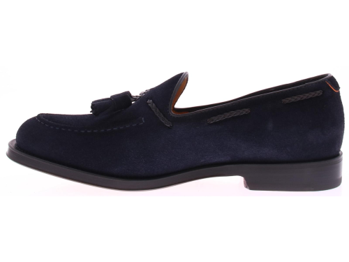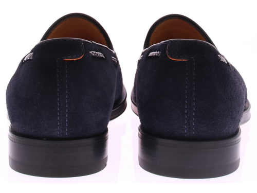 Men's loafer by Santoni article MCHI18101PC6SRVRU59 on hill last. The shoe is made goodyear and has a leather lining and sole. The upper is made of dark blue suede.