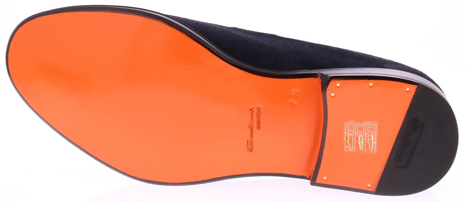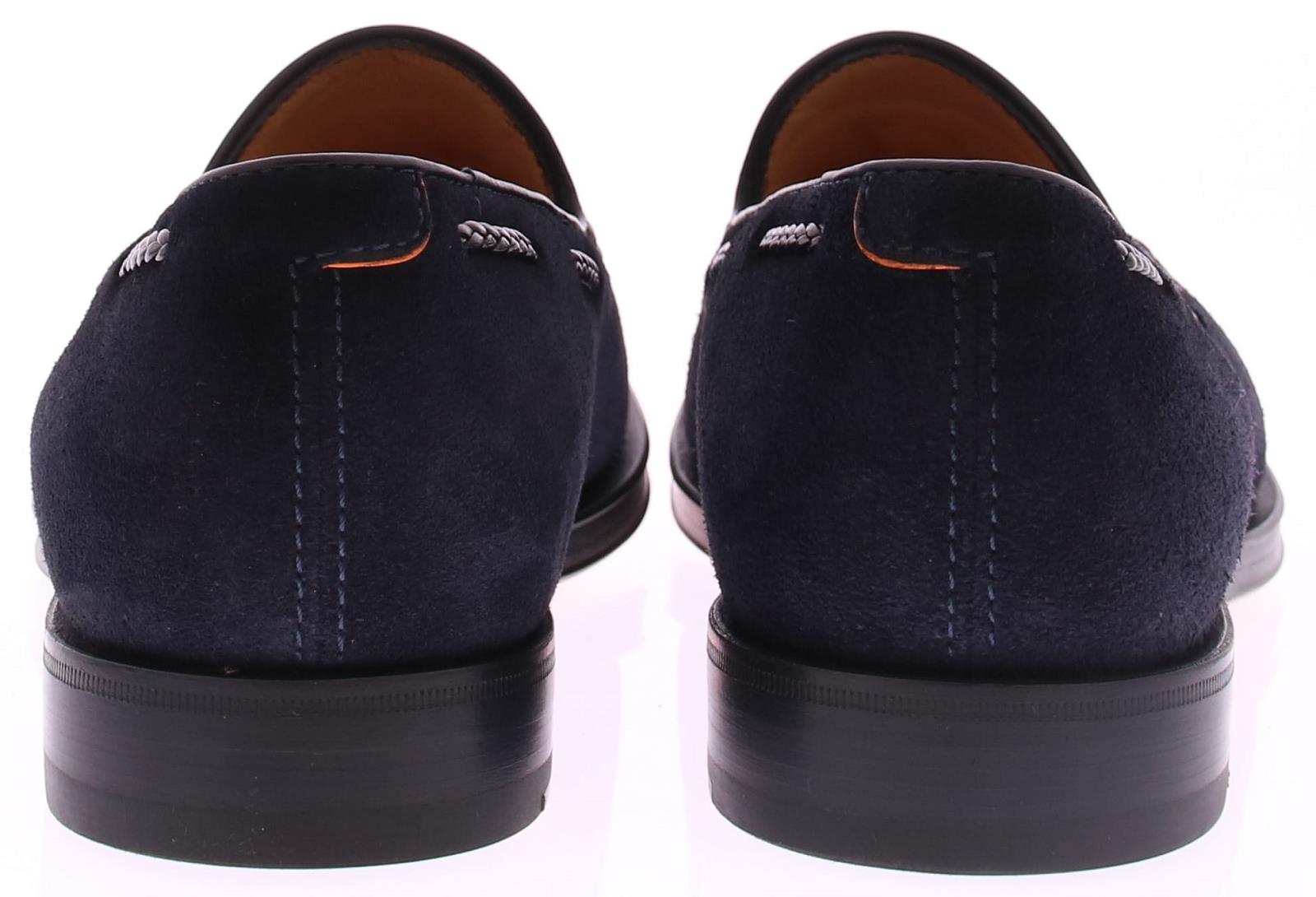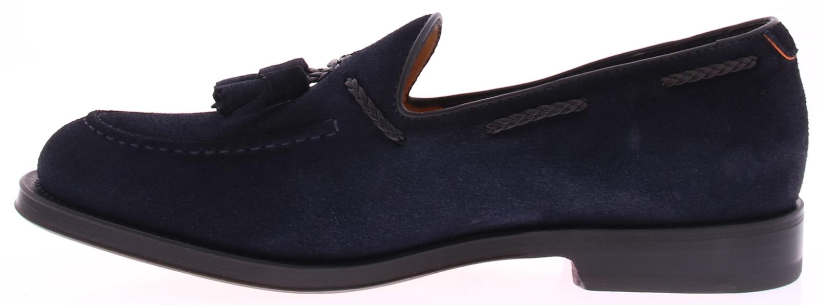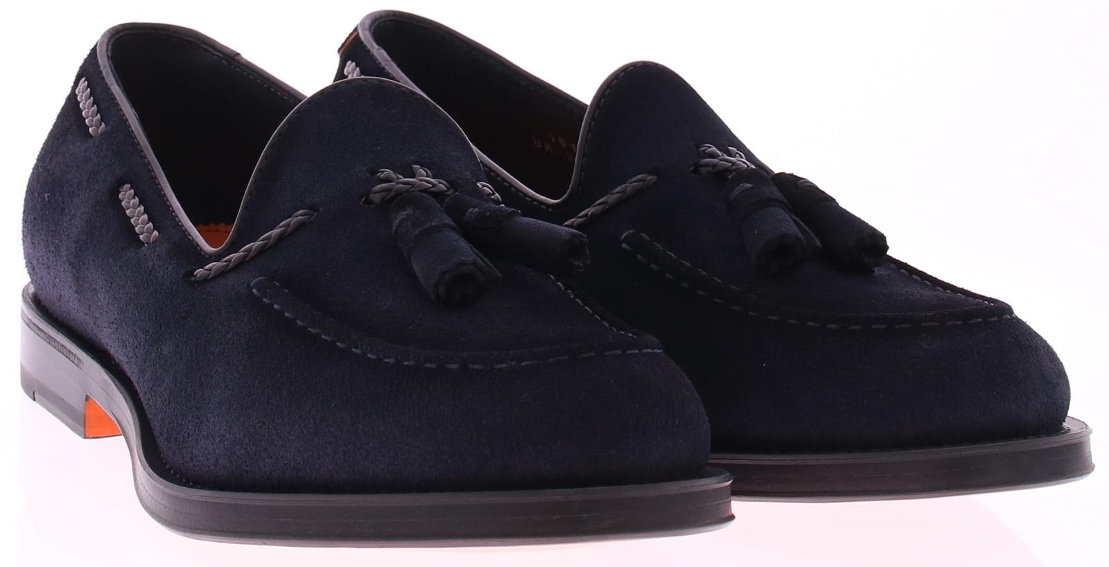 Men's loafer by Santoni article MCHI18101PC6SRVRU59 on hill last. The shoe is made goodyear and has a leather lining and sole. The upper is made of dark blue suede.