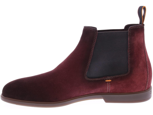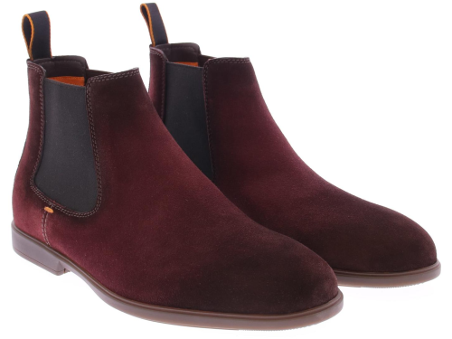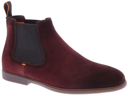 Bordeaux red suede men's Chelsea boots from Santoni. They feature elastic side panels and a pull tab at the back, making them quick and easy to put on and take off. The design is finished with a lightweight, flexible rubber sole for optimal grip. The insole is removable.