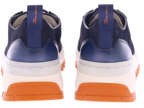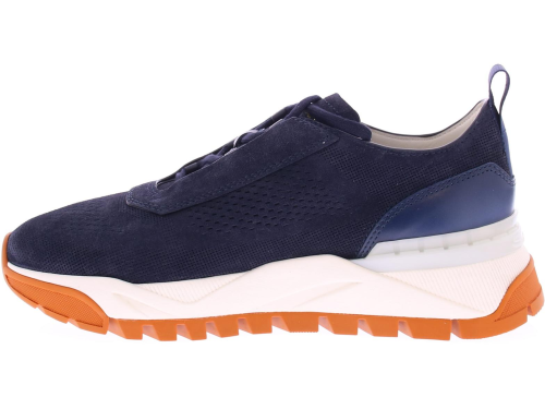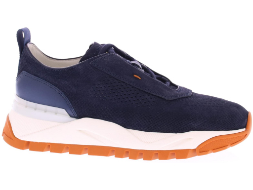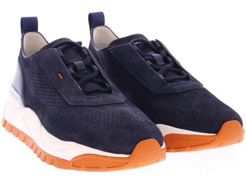 Dark blue suede men's sneaker from Santoni. With a thick rubber sole that supports the movement of the foot, and a pull tab at the back that makes it easy to put on and take off. The insole is removable.