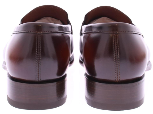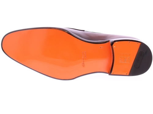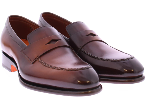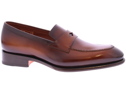 Cognac-colored leather men's loafer by Santoni. This luxury shoe is completely hand-colored and comes on a leather sole. The inside is made of leather and has a fixed footbed. This shoe is made goodyear.