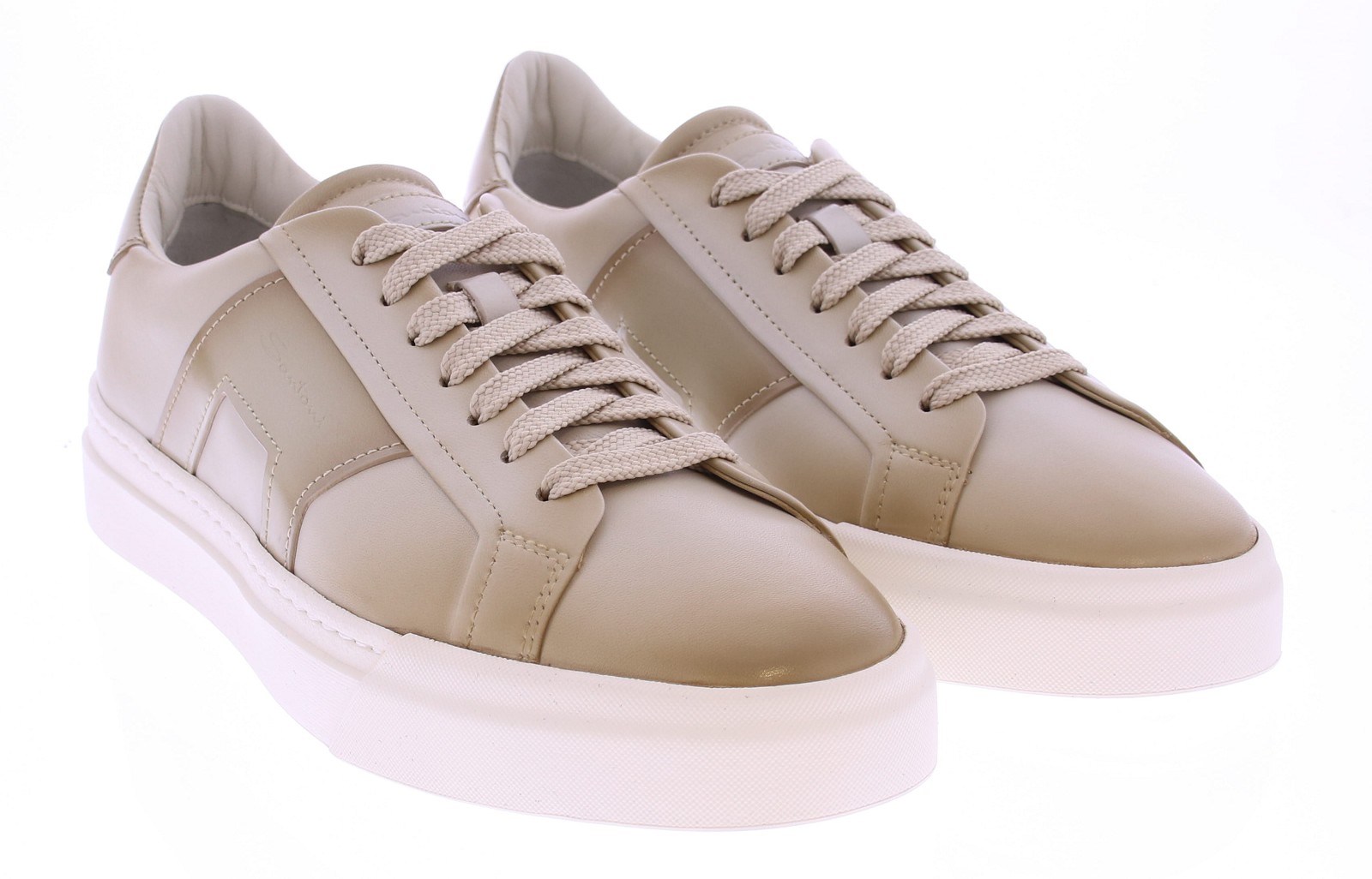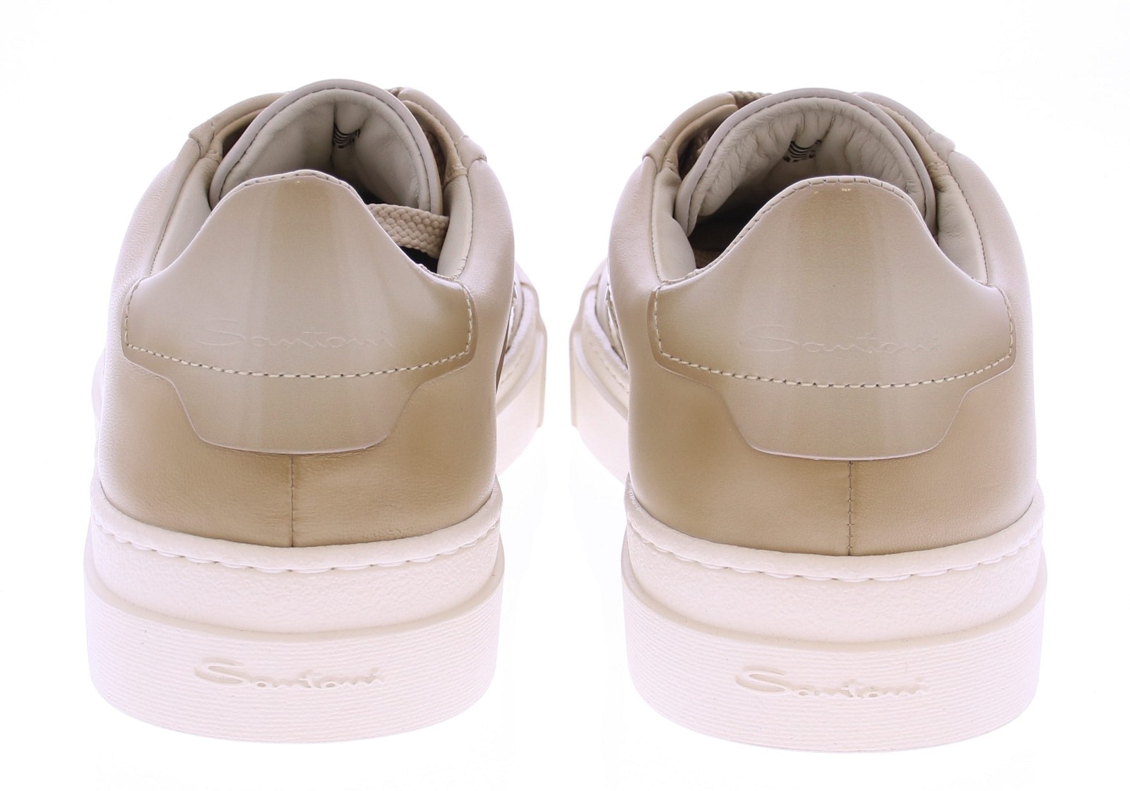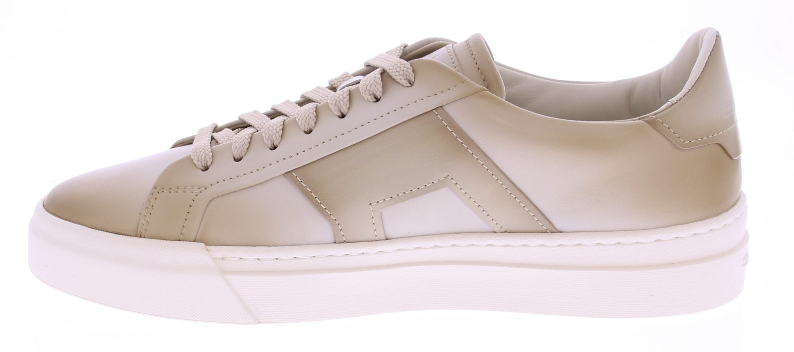 The Santoni 22018 GLORIA DBS is a luxurious men's sneaker crafted from cream-colored, super-soft nappa leather. The lining is full leather, and the removable footbed allows you to use your own insoles. The shoe is finished with a sporty white rubber sole, which provides a modern look and optimal comfort.
