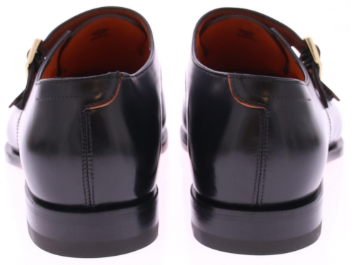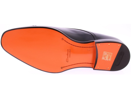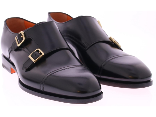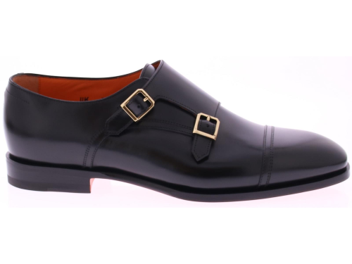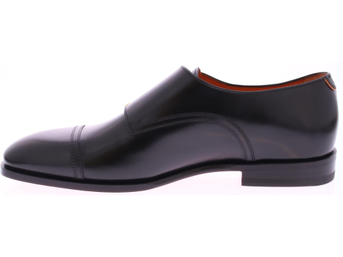 Santoni men's buckle shoe with a toe cap seam in black calf leather. Made using the Blake method. The product code is MCAD19027JC6BNTGN01. The shoe has a leather sole with an orange lining.