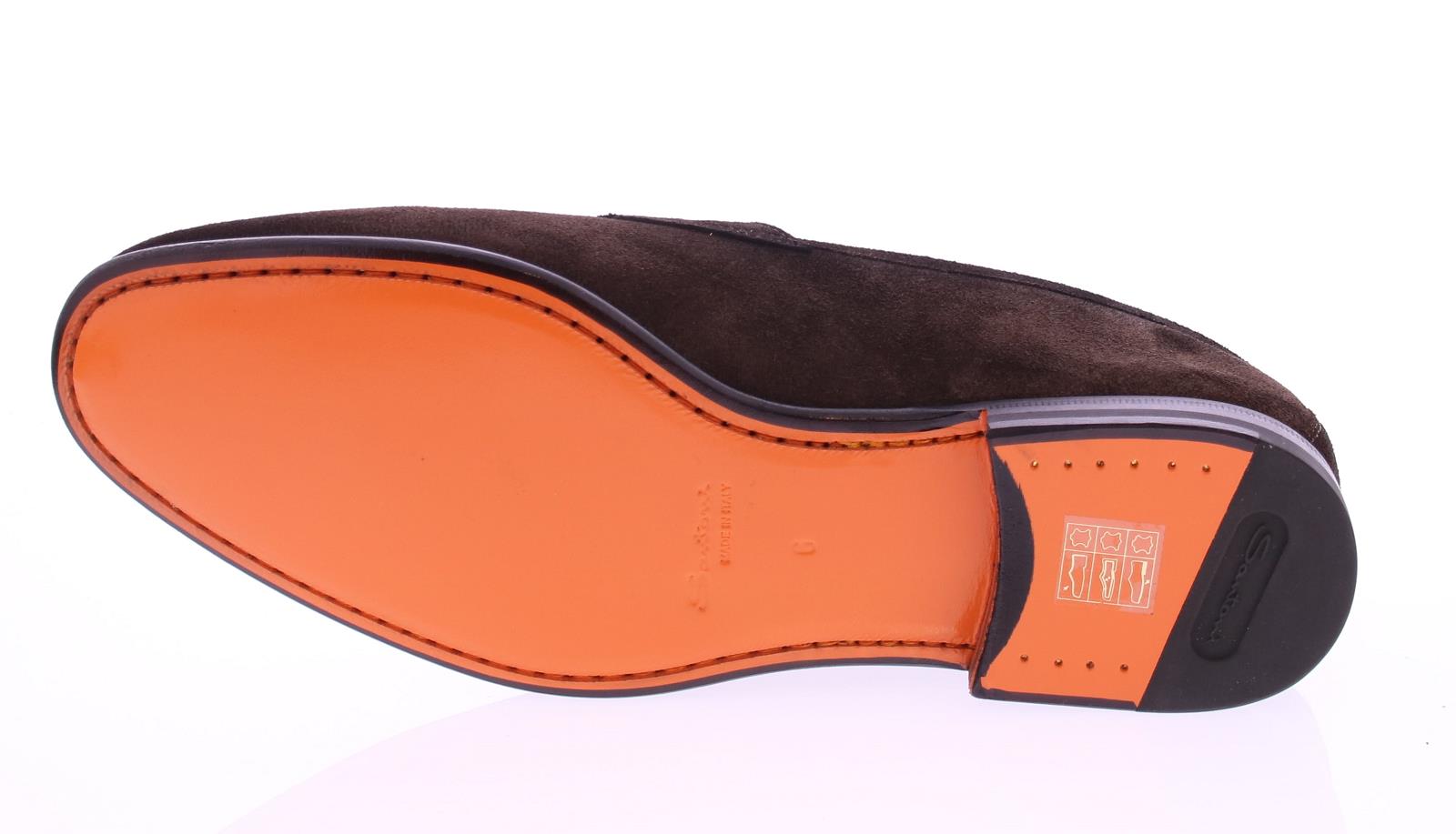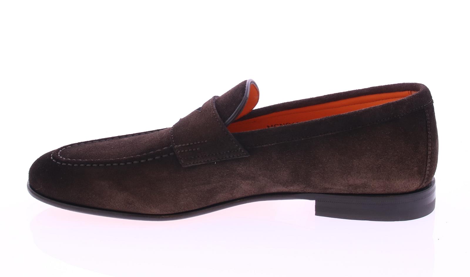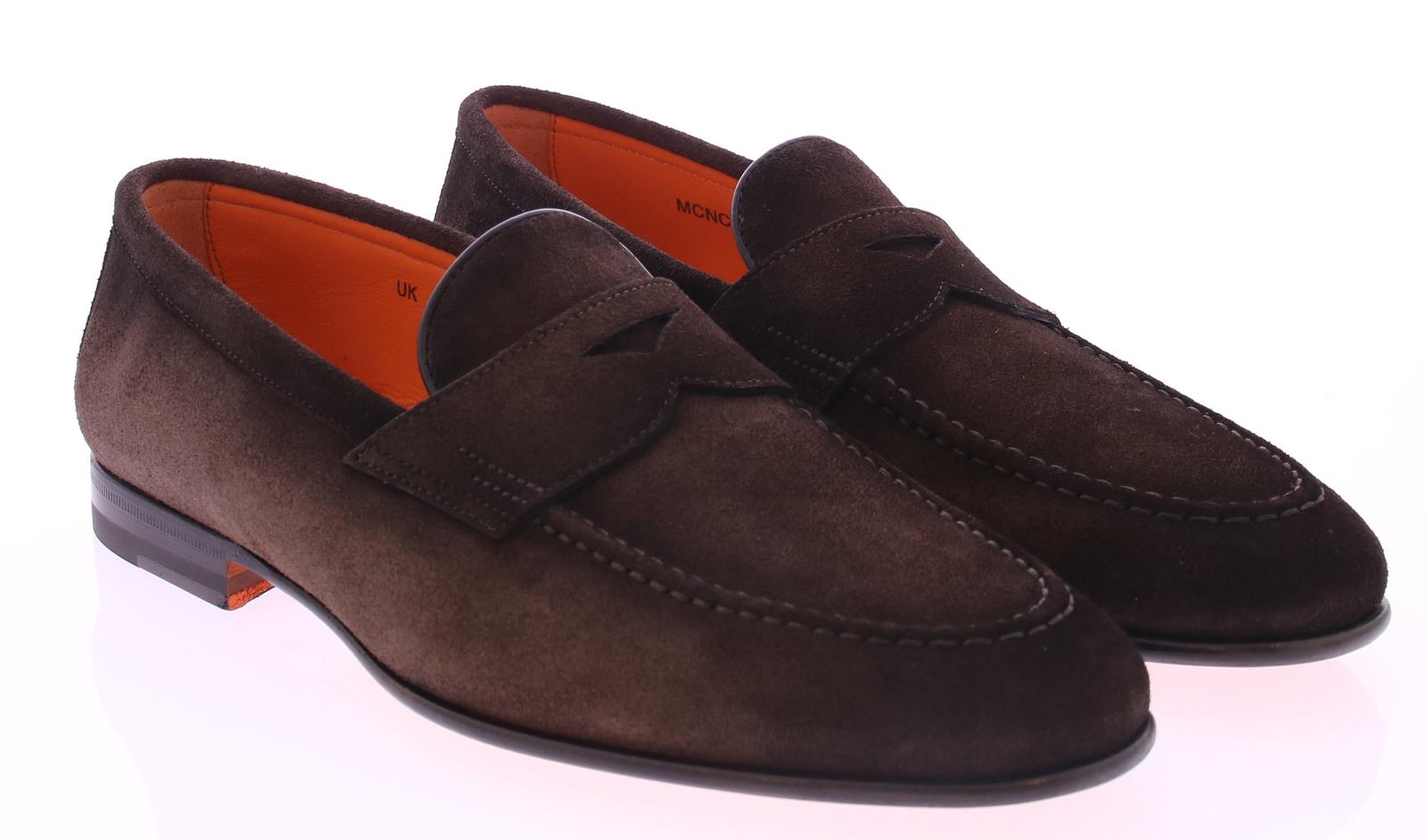 Santoni men's slip-on with a penny strap across the instep. The shoe, item MCNC19044LA3GGEXT50 SULLIVAN-GEXT50, is made of dark brown suede on a leather sole. The lining is leather.