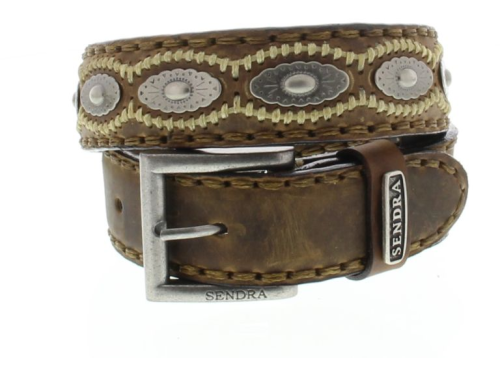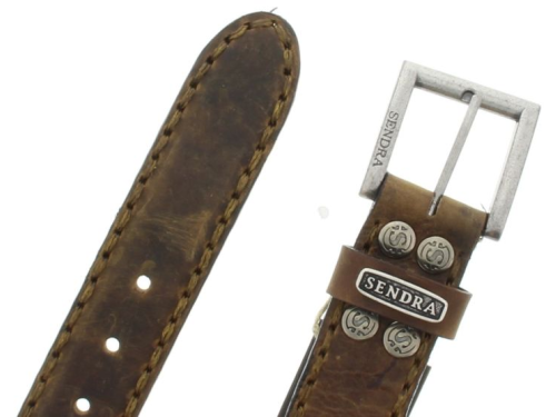 Sendra belt made of medium brown greased leather. Finished with conchos in matt silver and dark beige stitching. Available in unisex sizes 75 to 105. Sendra belts are small. Someone with size 90 should have a 95 from Sendra.