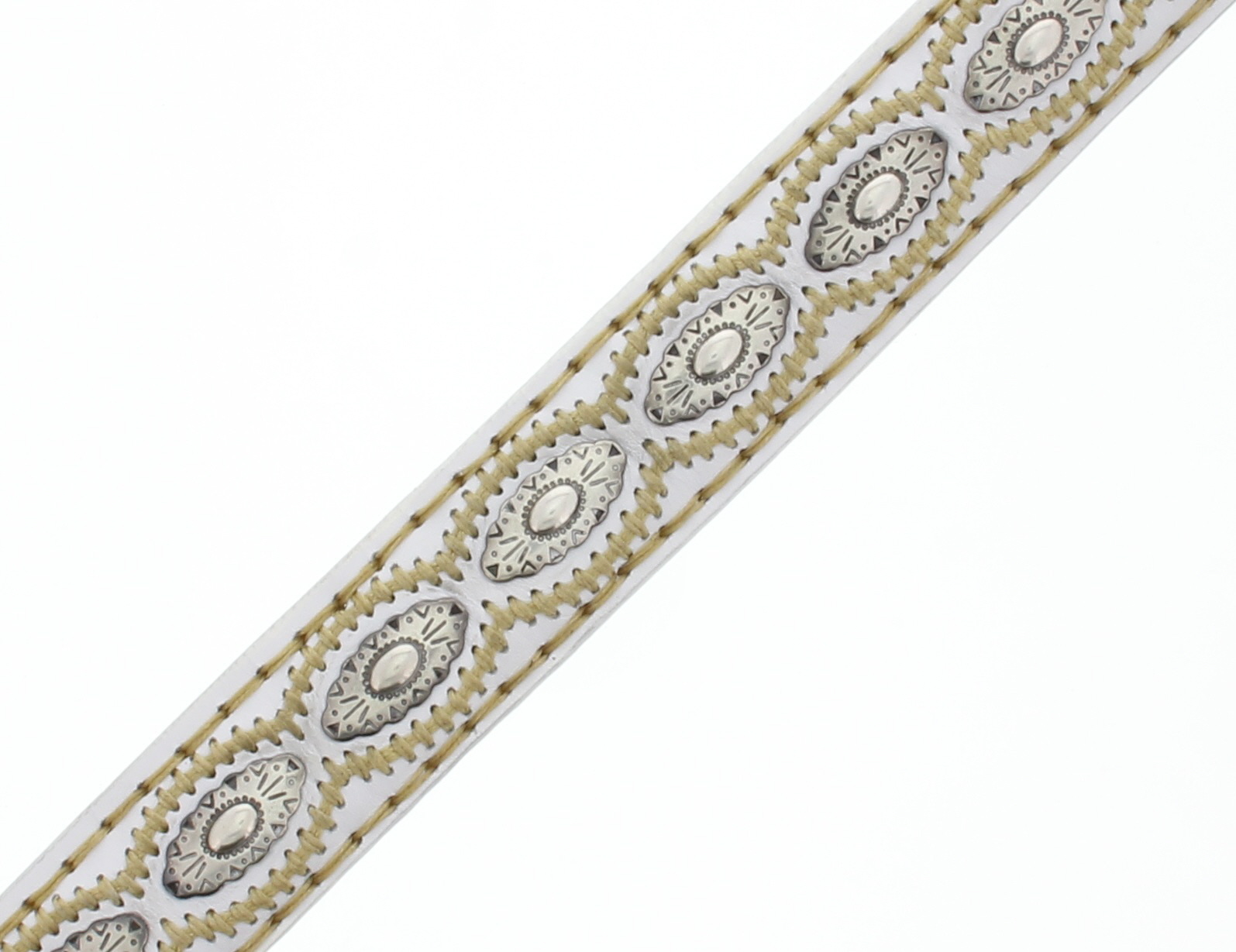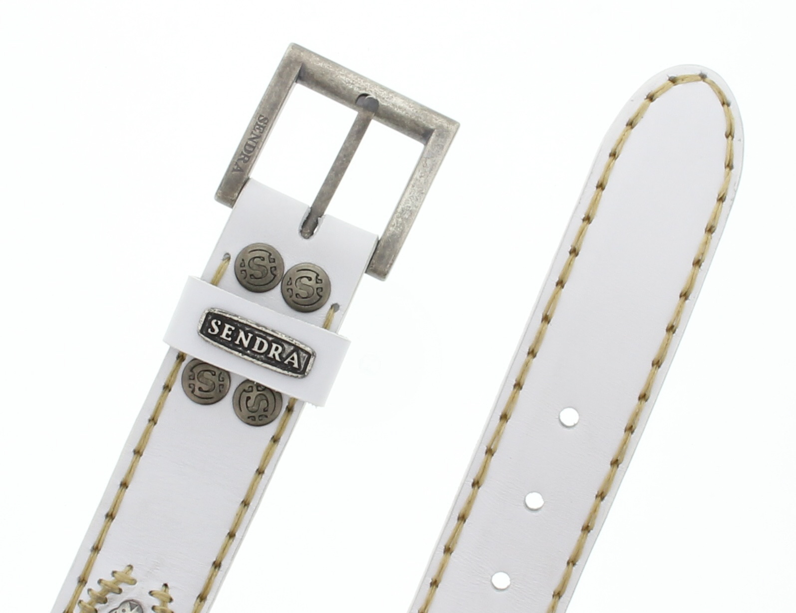 White leather belt from Sendra with silver conchos and white stitching. Sendra belts are handmade in Spain and are available in various lengths. This belt cannot be shortened