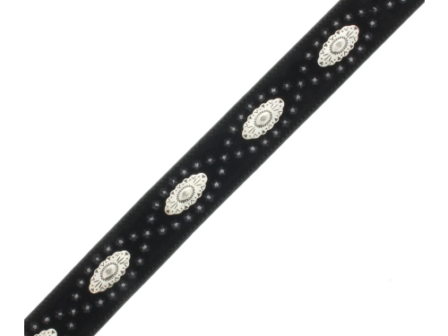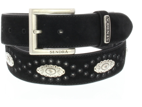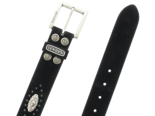 Black suede women's belt by SENDRA. The belt is made with matt silver metallic stars around the oval silver decoration. The size is 5 cm smaller than normal. So someone with size 90 cm needs the 95 cm from Sendra. The belt is available in different sizes.