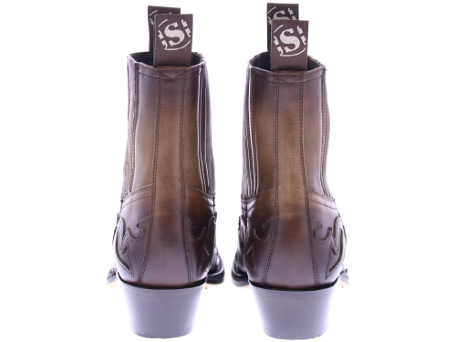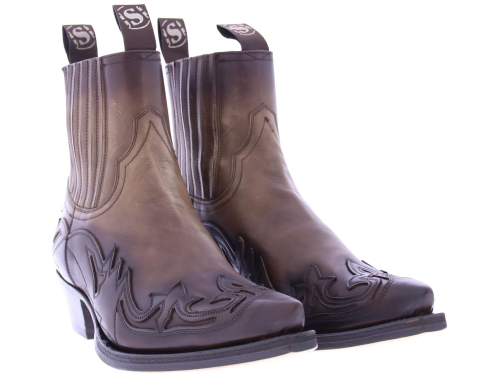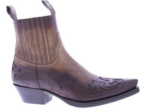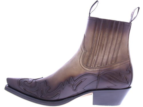 Brown leather men's cowboy boot by Sendra. The boot has the classic cowboy design, with striking details that emphasize the western style. At the front, the boot has a pointed toe, characteristic of cowboy boots. The shaft of the boot is decorated with beautiful stitching and patterns that give the boot an authentic look.