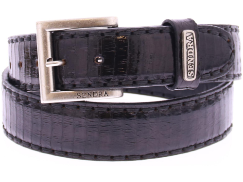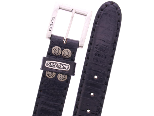 Sendra men's belt in black cobra leather. The belt is made entirely from the middle belly scale of the cobra. It's available in various lengths and runs 5 cm smaller because the manufacturer doesn't include the buckle in the length. (It can be replaced with snaps for a different type of buckle.) Therefore, when ordering, most people order 5 cm larger than their usual belt size. Furthermore, the belt is hand-finished with coarse stitching and has a leather lining.