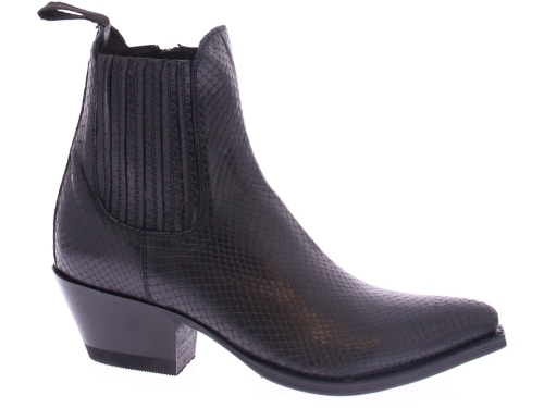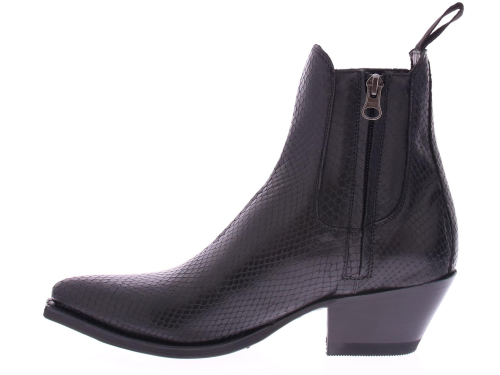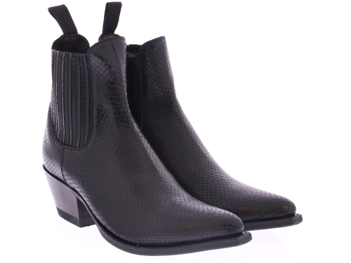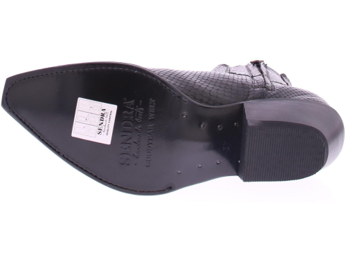 Black leather women's boot with snake print by Sendra. This short boot has a zipper and elastic insert for easy on and off. The slanted heel has a height of 4 cm, and the sole is made of leather.