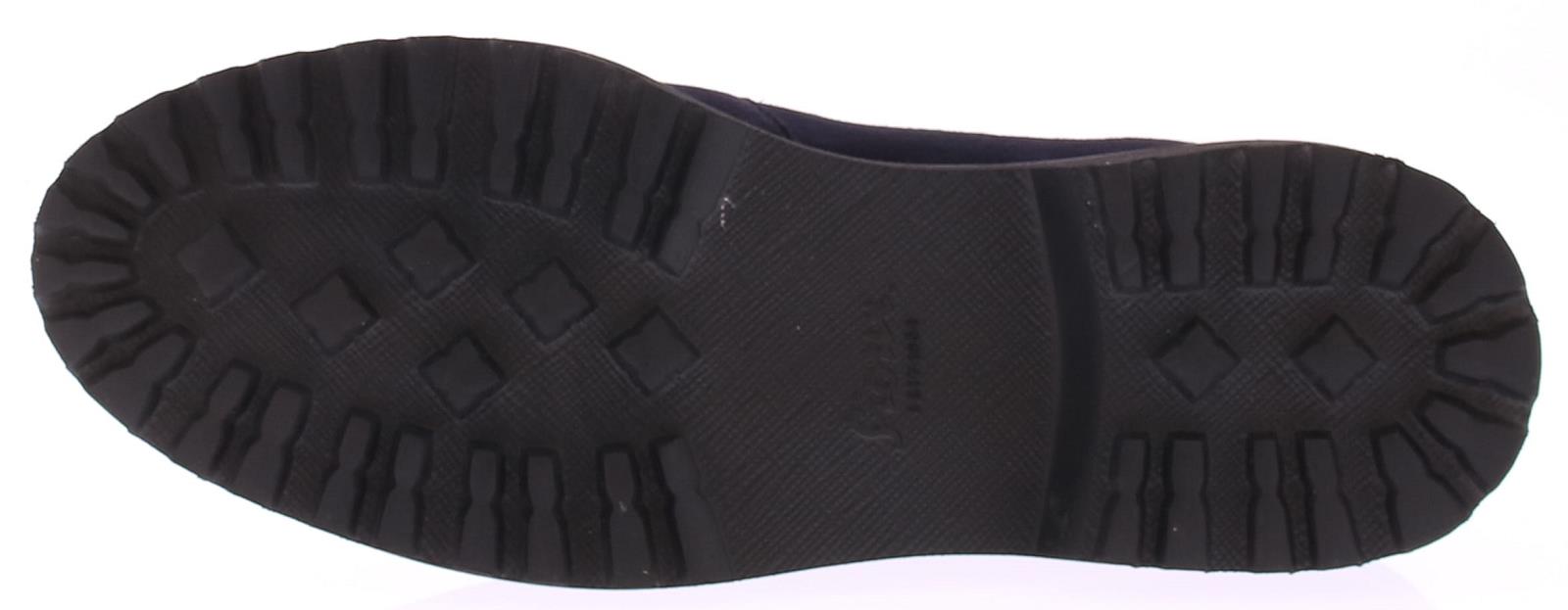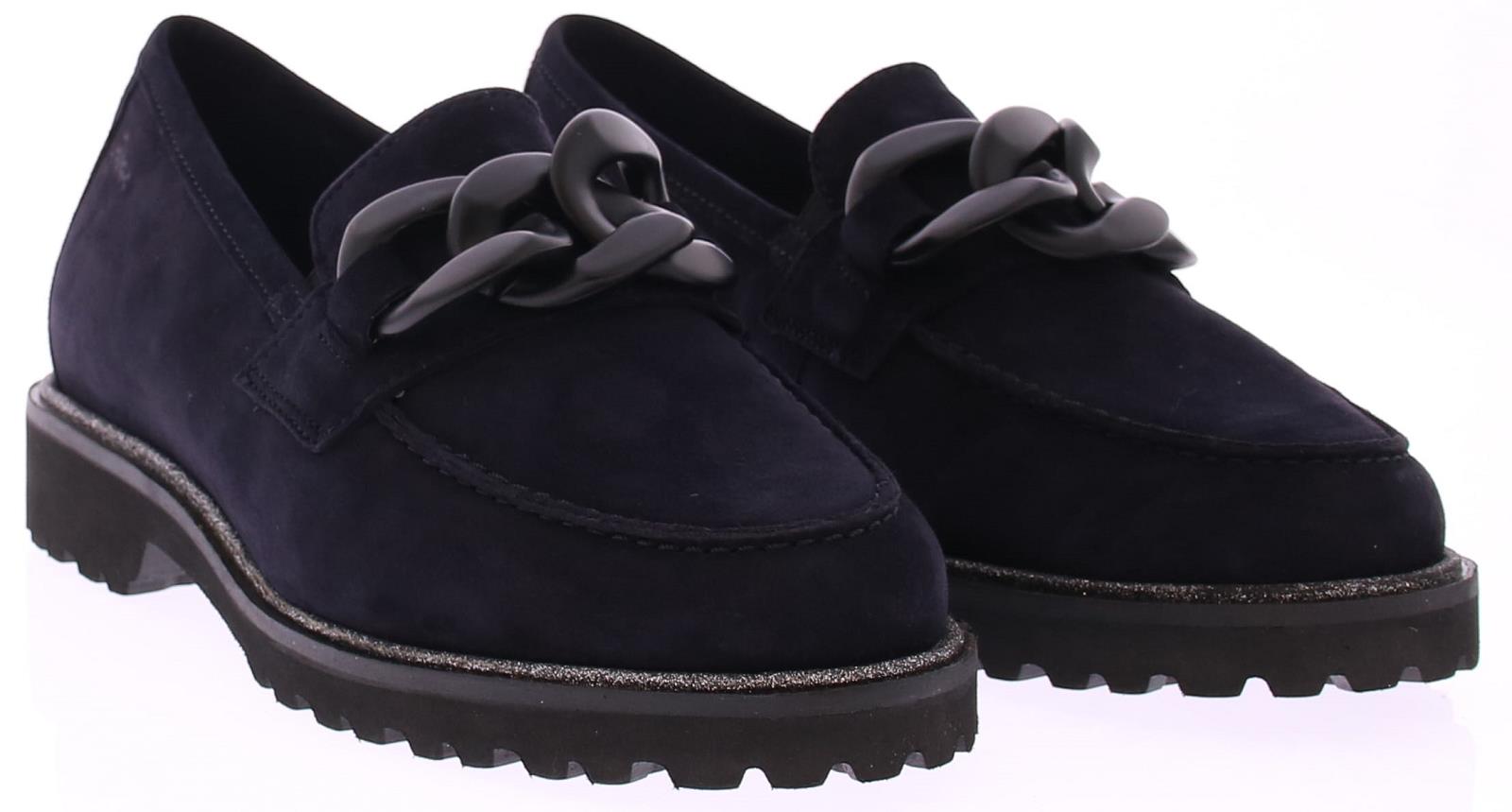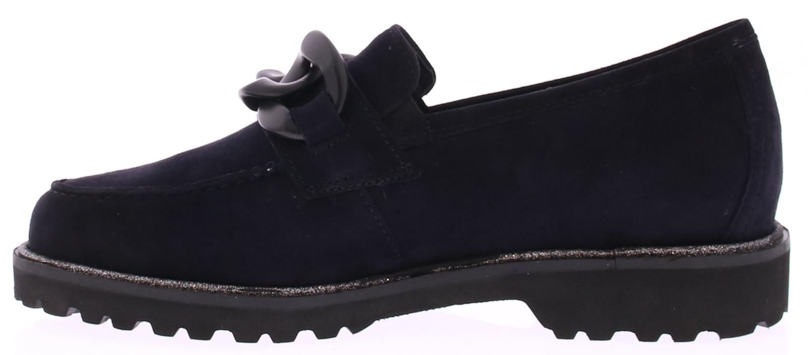 Black suede women's loafer from Sioux. This shoe features a matte black link on the instep, with a subtle glitter trim around the edge. The width of this loafer is an H, meaning it's slightly wider than usual. It has a rubber sole with a coarse tread.