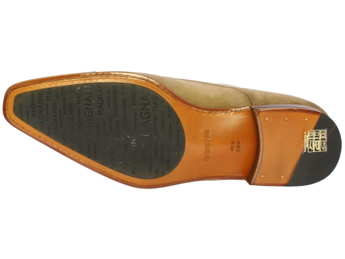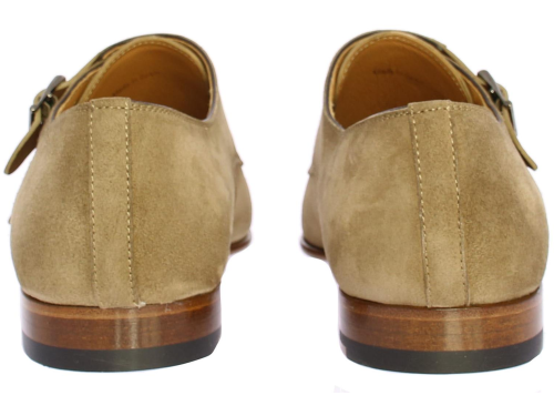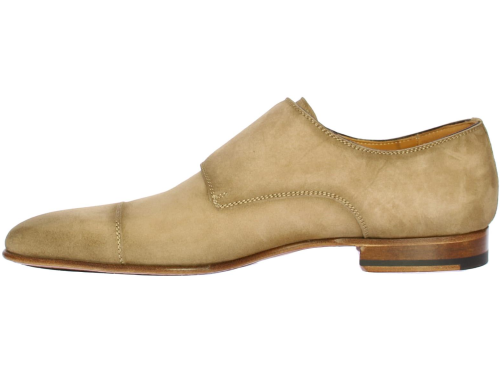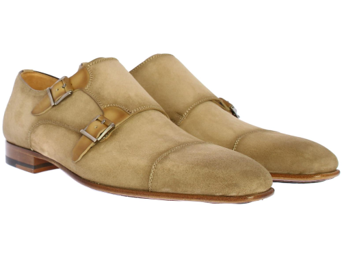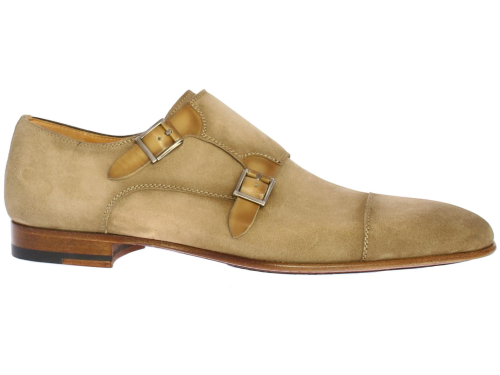 Taupe-colored suede men's double buckle shoe by Magnanni. This shoe is equipped with a toe seam. The shoe is leather lined and has a leather sole with rubber insert.
