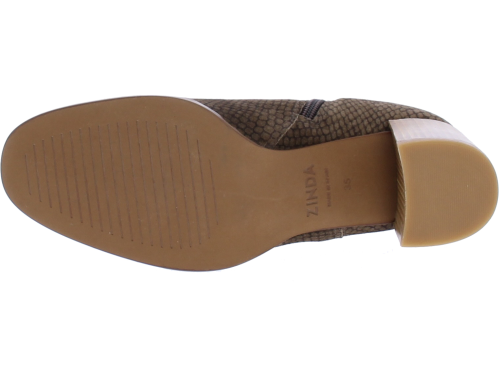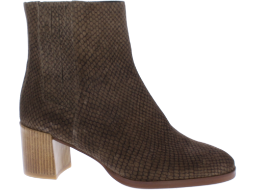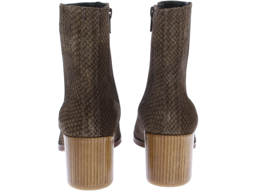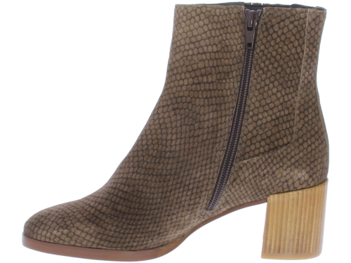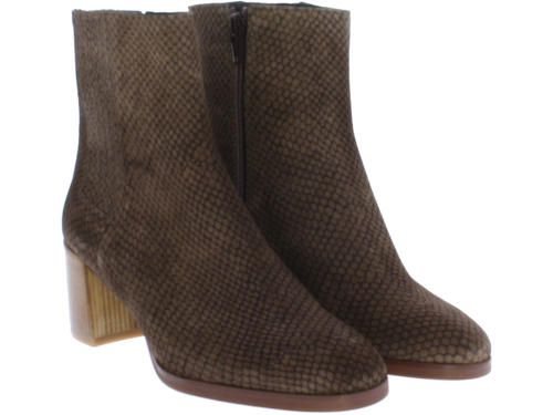 Taupe-colored suede ankle boot by Zinda. This ankle boot is made of taupe-colored suede with a print. The heel has a wooden look. The heel is 6cm.