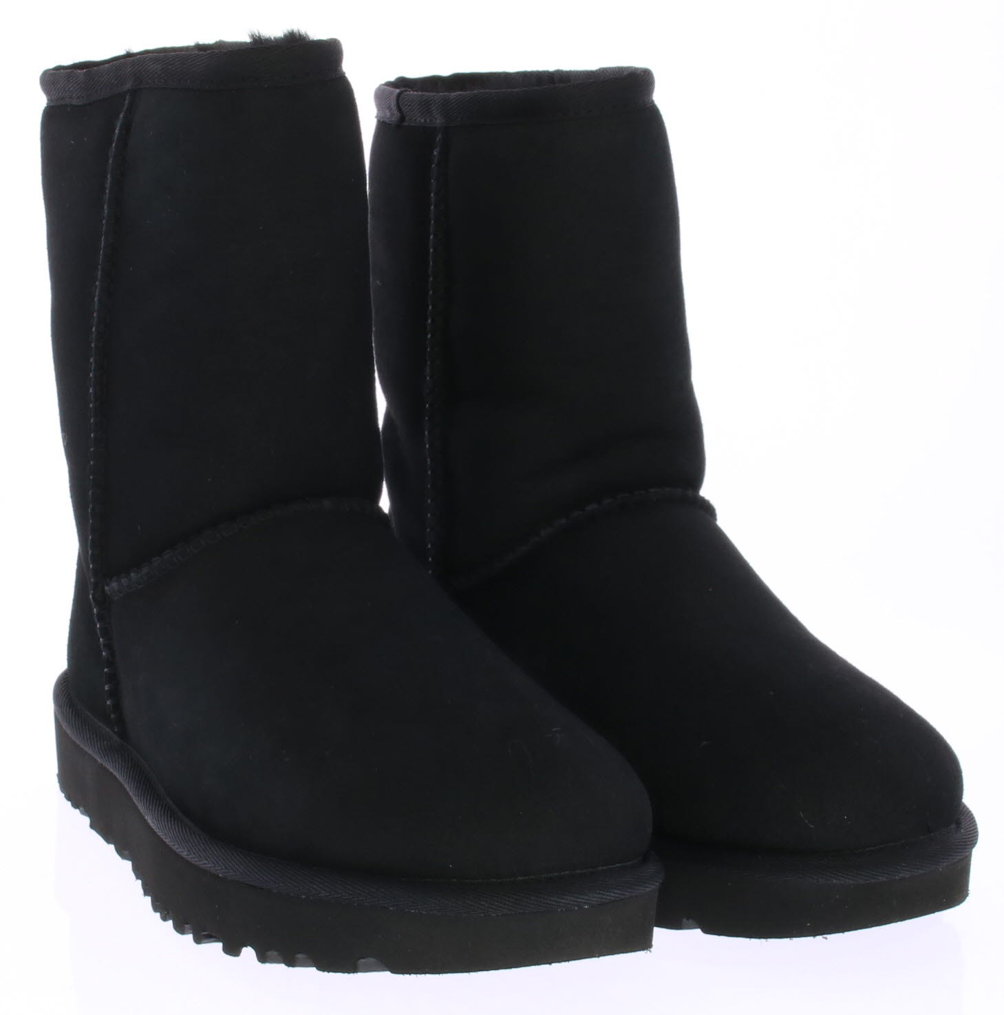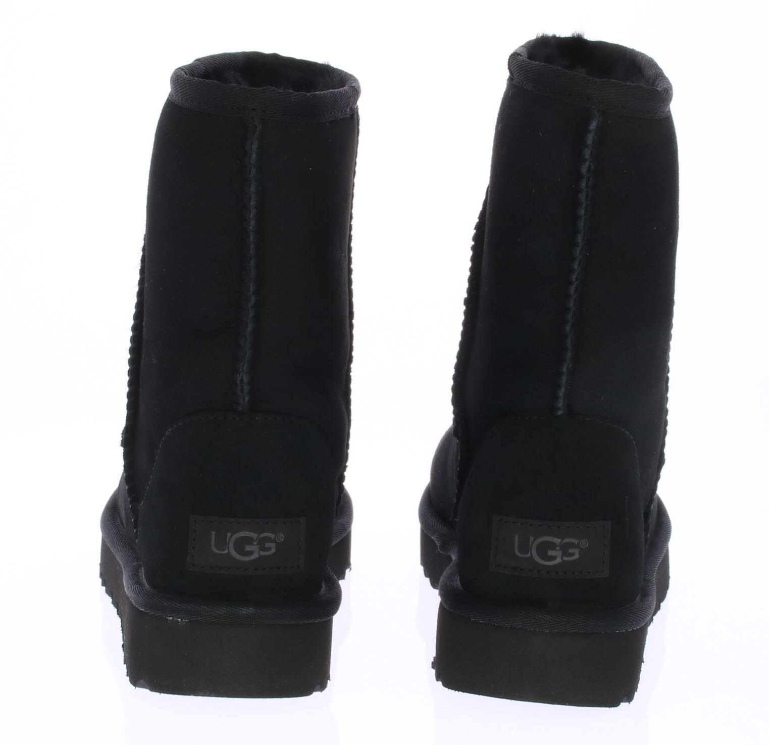 Black suede women's short boot by Ugg. The Classic short black. Wonderfully warm and soft due to the sheepskin lining.