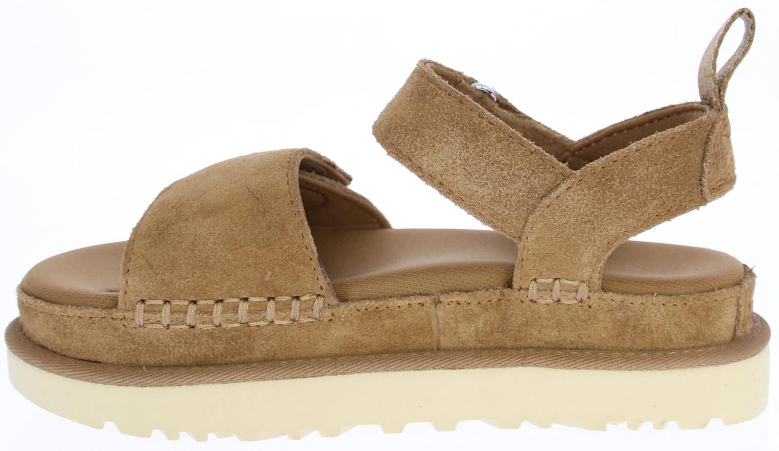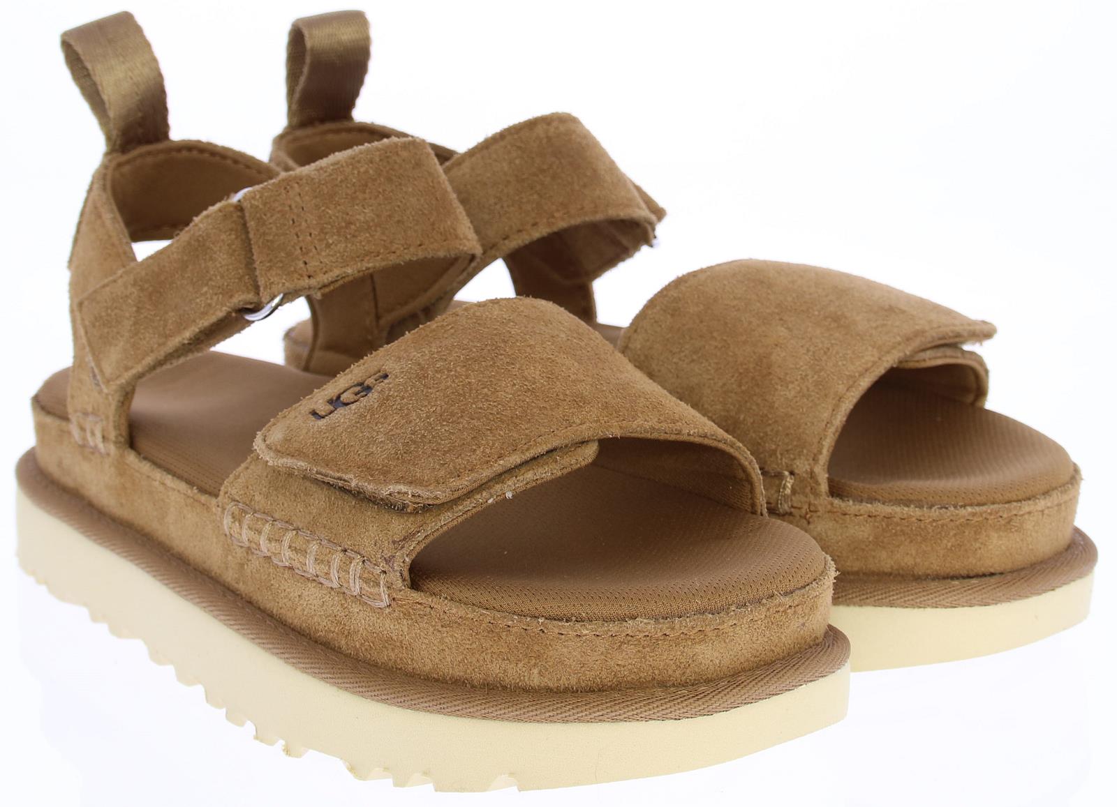 Mid-brown suede women's sandals from Ugg. These sandals are made of suede and have a soft, supple textile lining for a perfect fit. The sturdy rubber sole makes these sandals ultra-comfortable. They are easy to put on and close with a hook-and-loop closure.