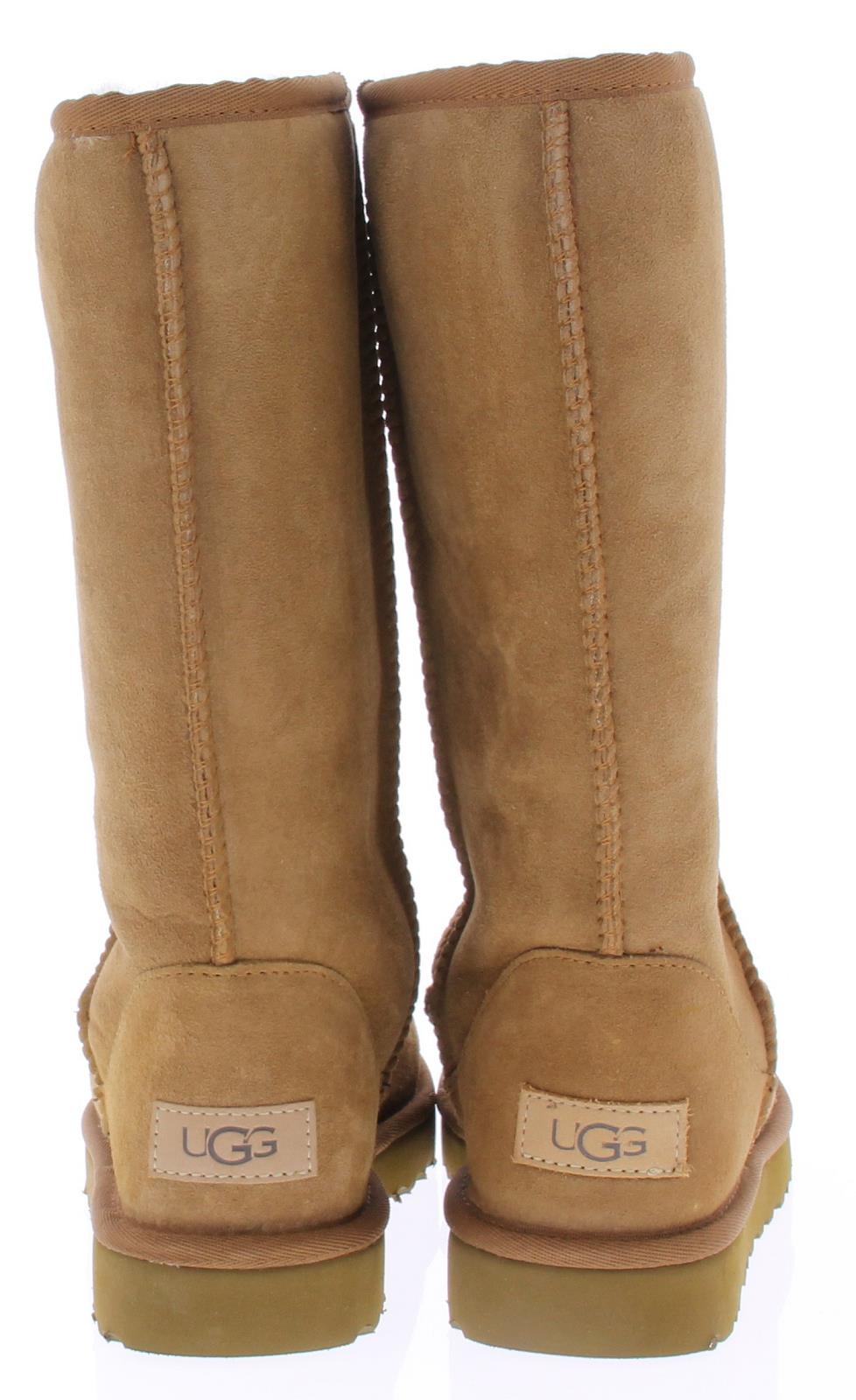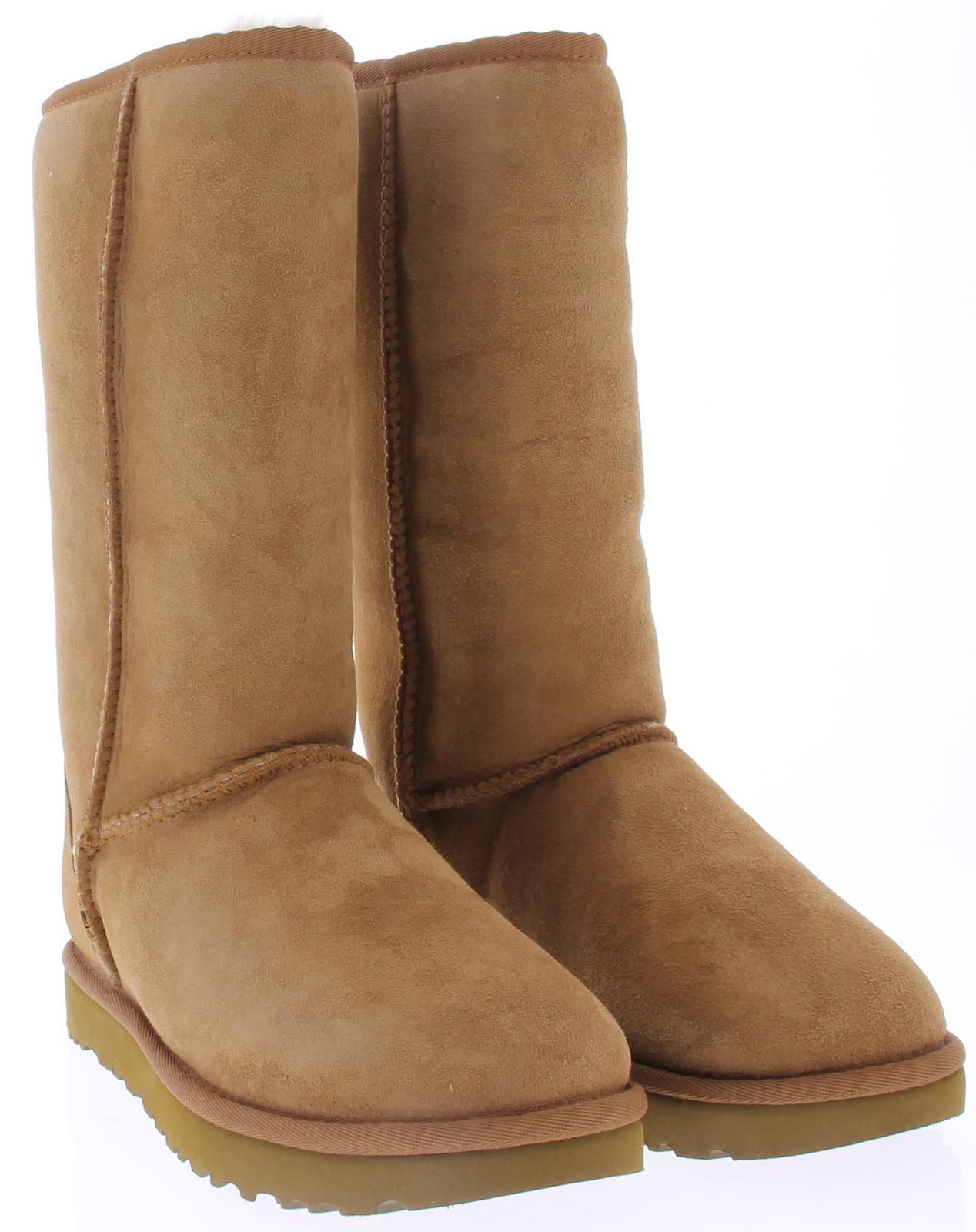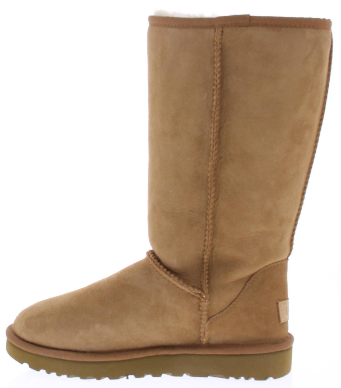 Mid-brown suede tall women's boot from UGG. The Classic Tall is made of double-faced sheepskin and suede, features a pull tab at the back, decorative butt seams, a sheepskin insole, and nylon stitching. This classic UGG model is lined with fur, making it wonderfully warm for winter weather.