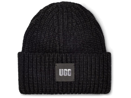 Black women's beanie from Ugg. The article name of this beanie is 'Chunky Rib Beanie Black'. The beanie is half folded with the Ugg logo on the front. The beanie can be worn as a beanie. Made of 78% acrylic, 17% nylon, 5% wool. Goes well with the matching scarf 39577.
