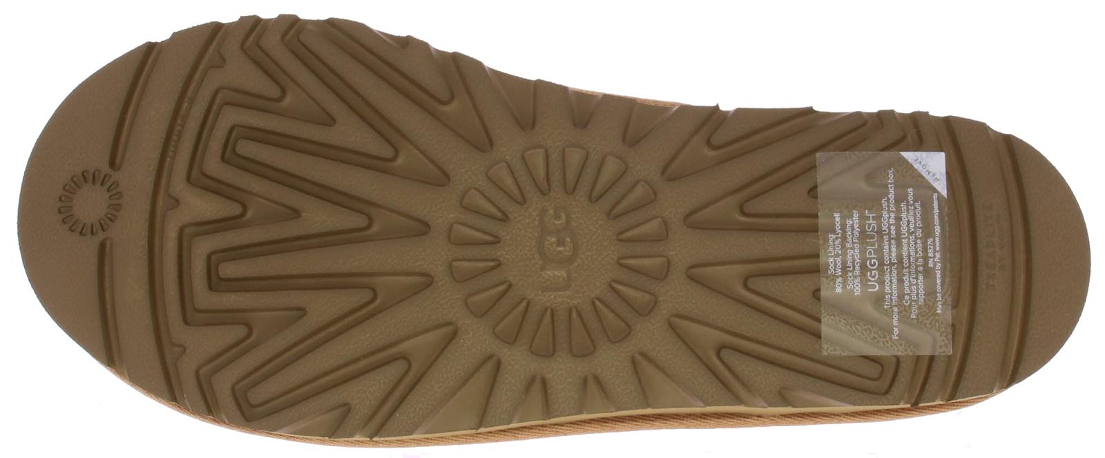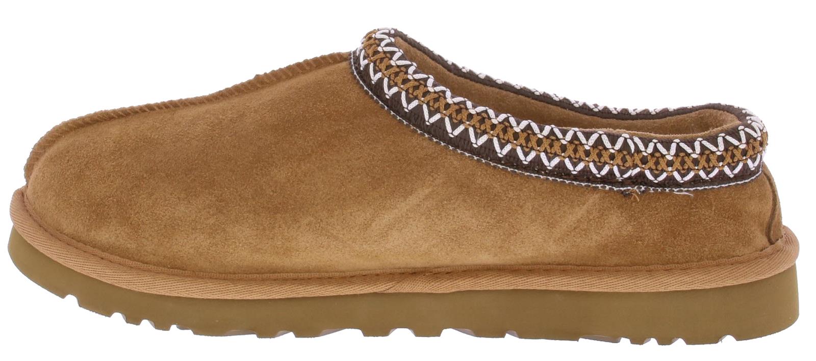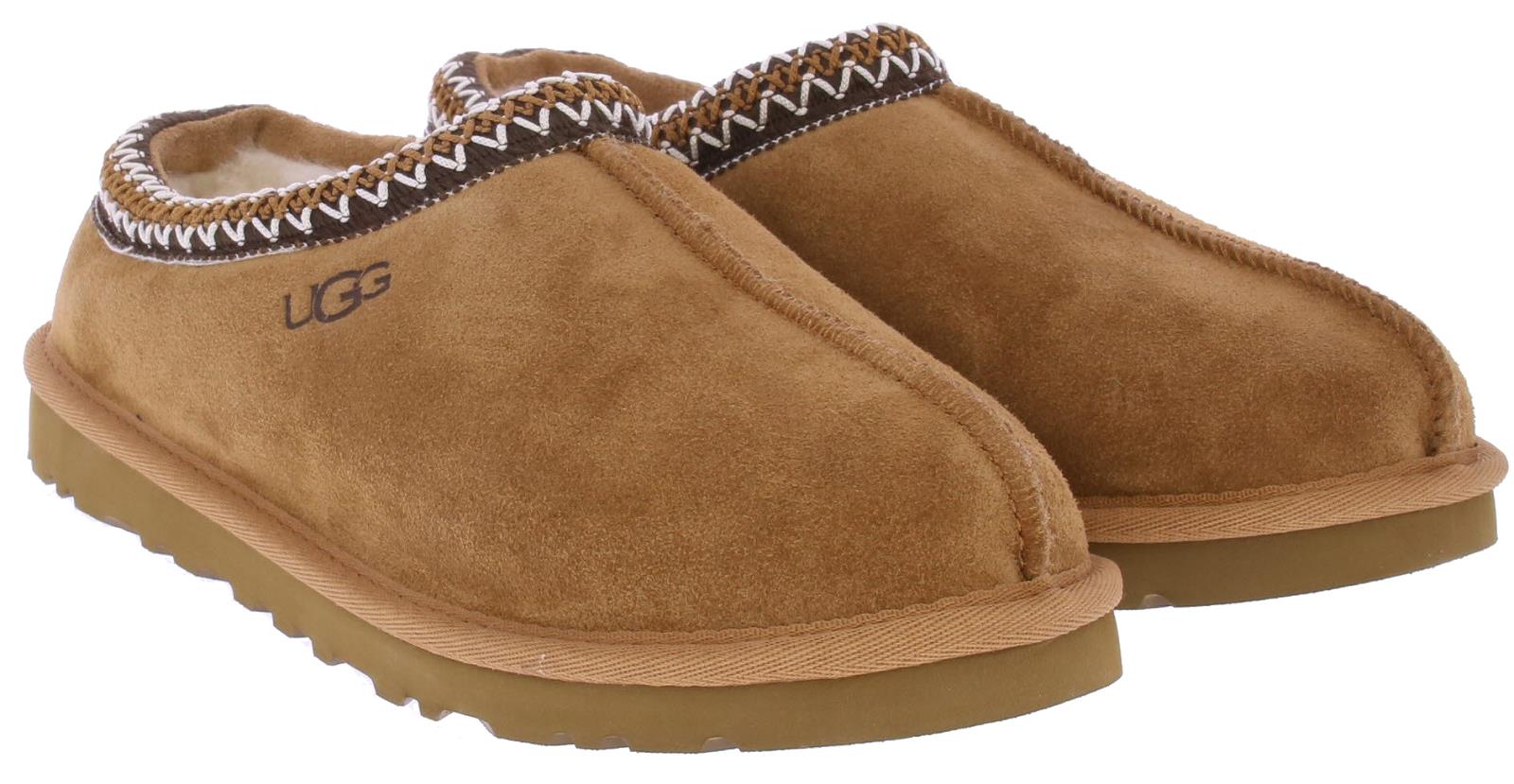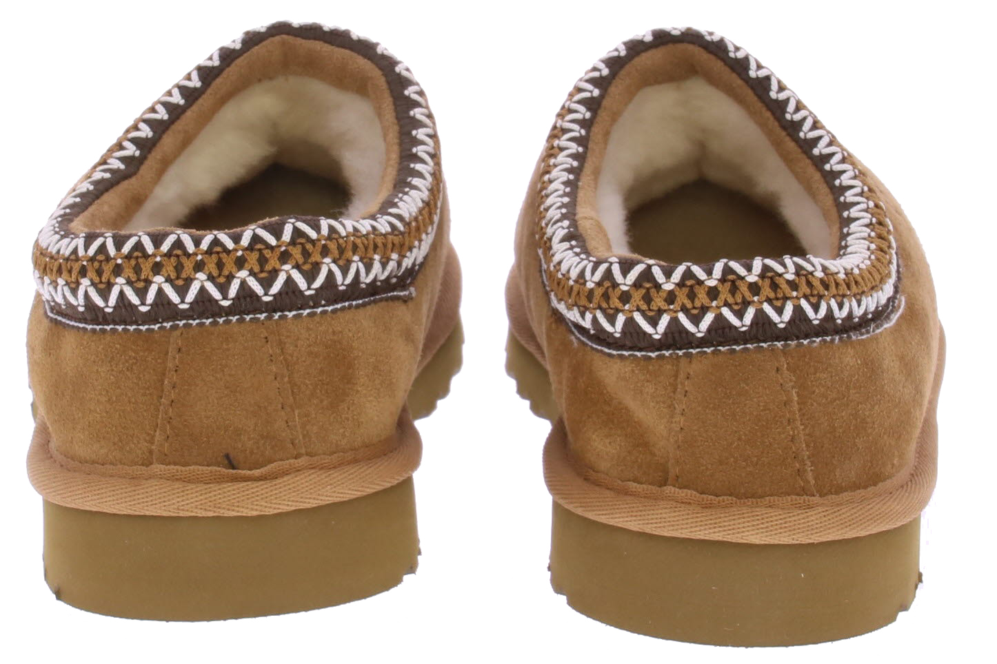 Mid brown men's mules from Ugg. Model Tasman chestnut. The lining is sheepskin and along the instep is an embroidered edge of dark brown with light brown and beige. The sole is rubber and on the side is a small Ugg logo.